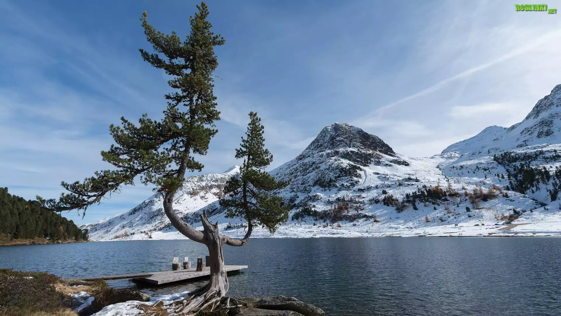 Drzewo, Sosna, Ośnieżone, Góry, Alpy, Jezioro, Obersee, Pomost, Park Narodowy Berchtesgaden, Bawaria, Niemcy |