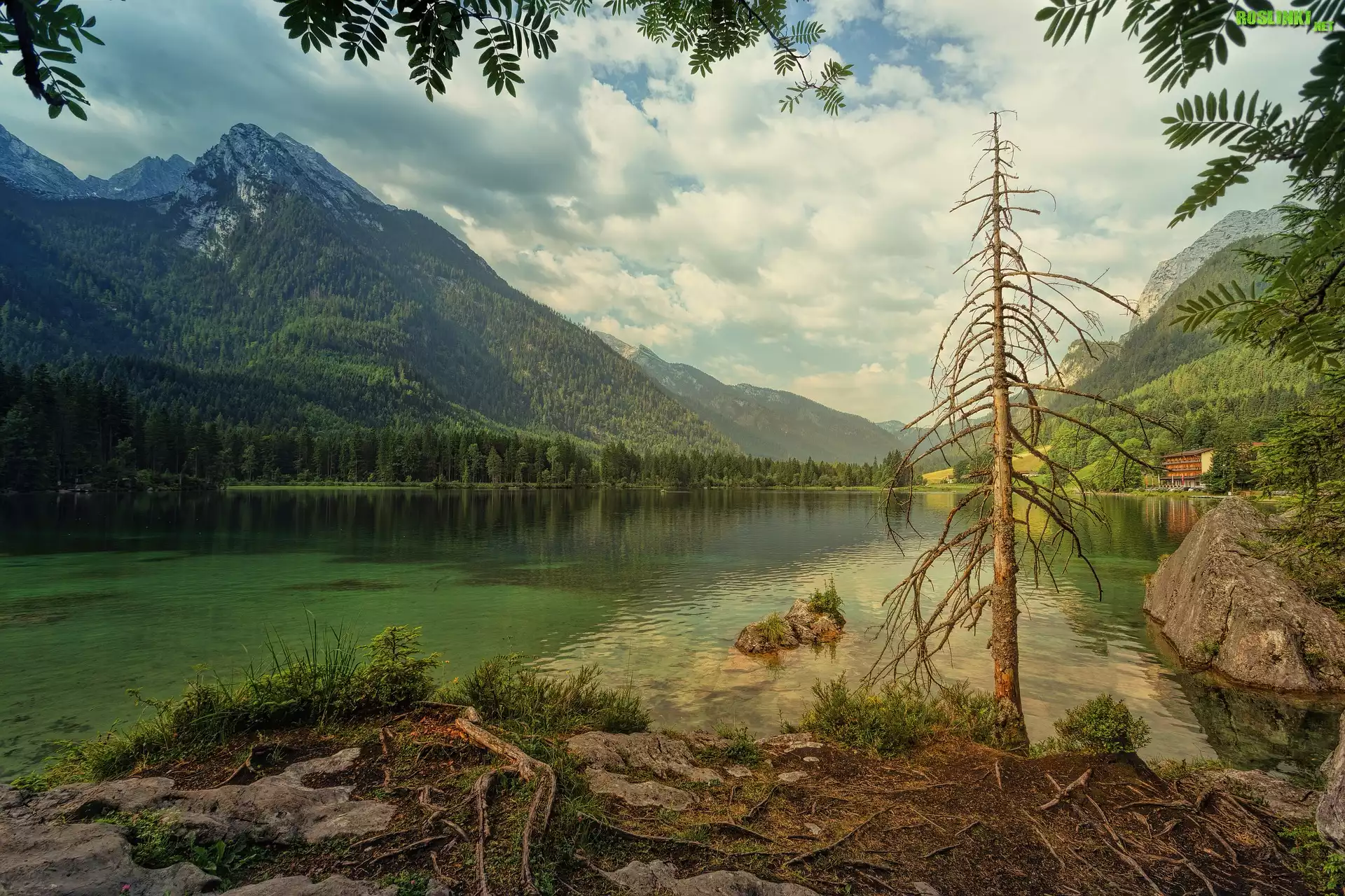 Góry Alpy, Jezioro Hintersee, Lasy, Drzewo, Gmina Ramsau bei Berchtesgaden, Bawaria, Niemcy