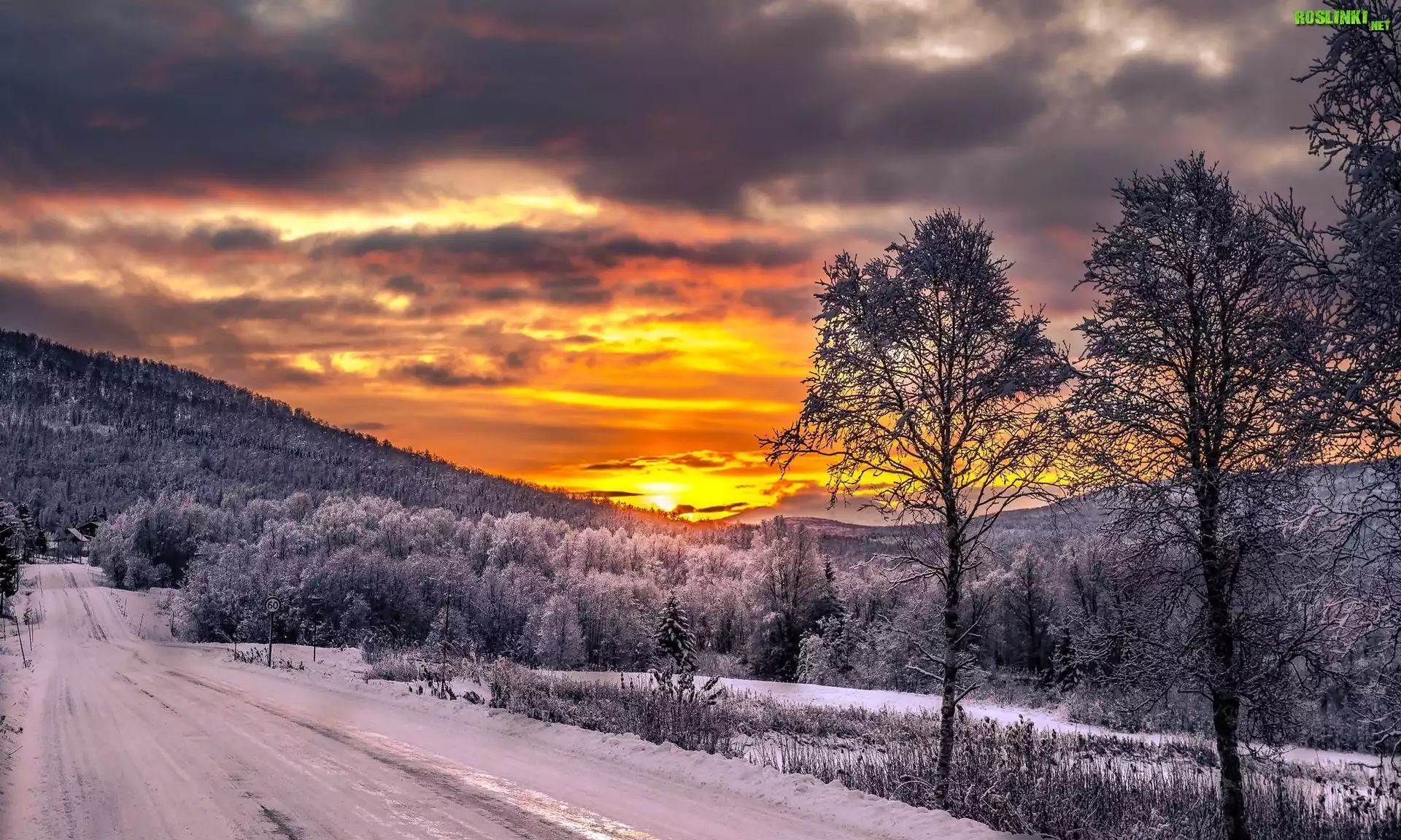Rośliny: Norwegia, Wyspa Senja, Droga, Góry, Lasy, Zachód słońca, Zima, Drzewo