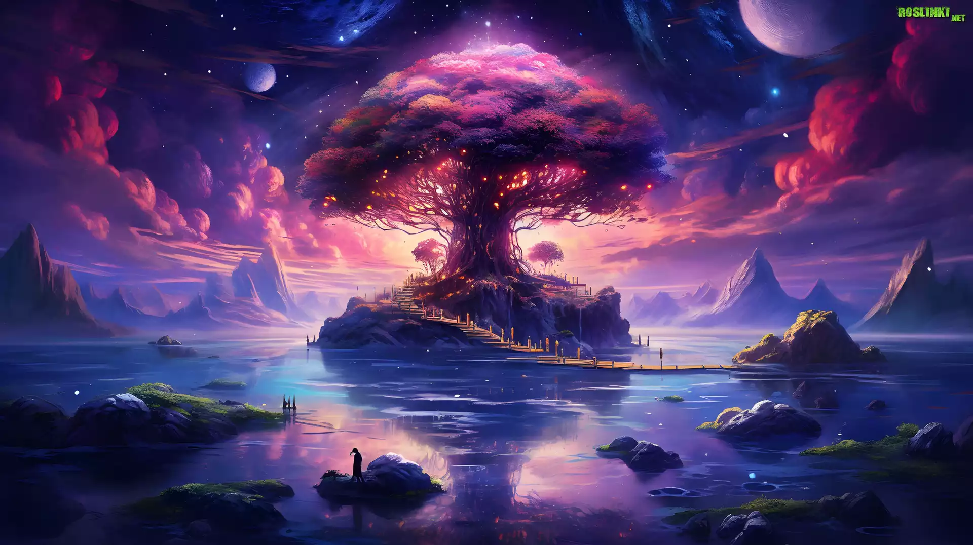 Rośliny: Drzewo, Wyspa, Jezioro, Góry, Niebo, Chmury, Planety, Gwiazdy, Grafika Fantasy