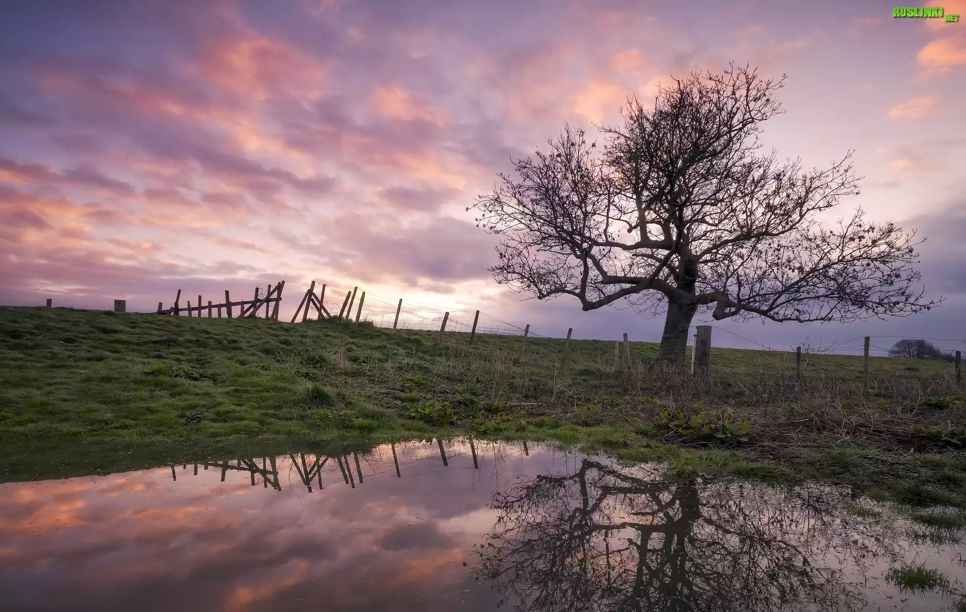 Drzewo, Ogrodzenie, Kałuża, Odbicie