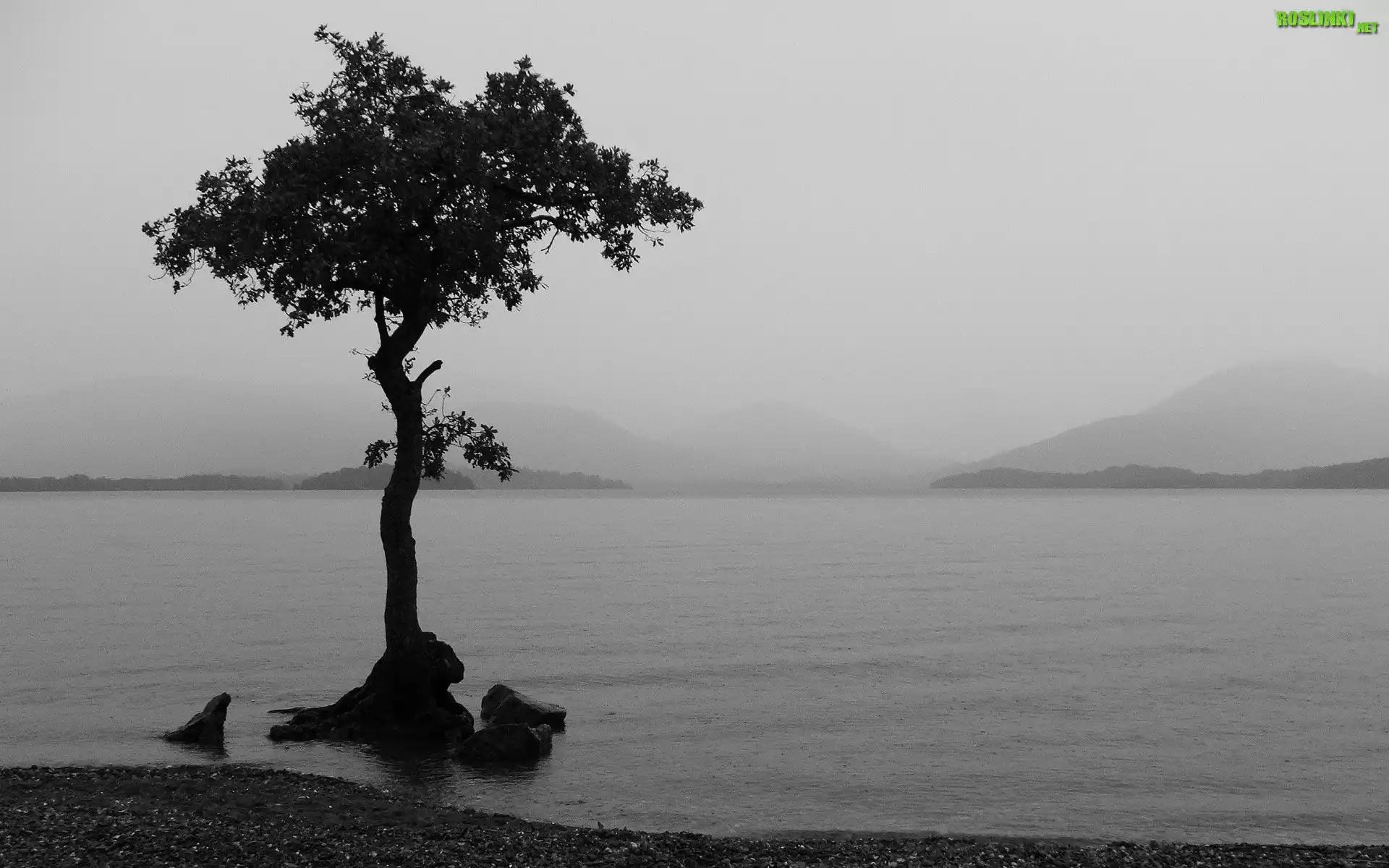 Rośliny: Drzewo, Jezioro, Góry, Kamienie, Mgła