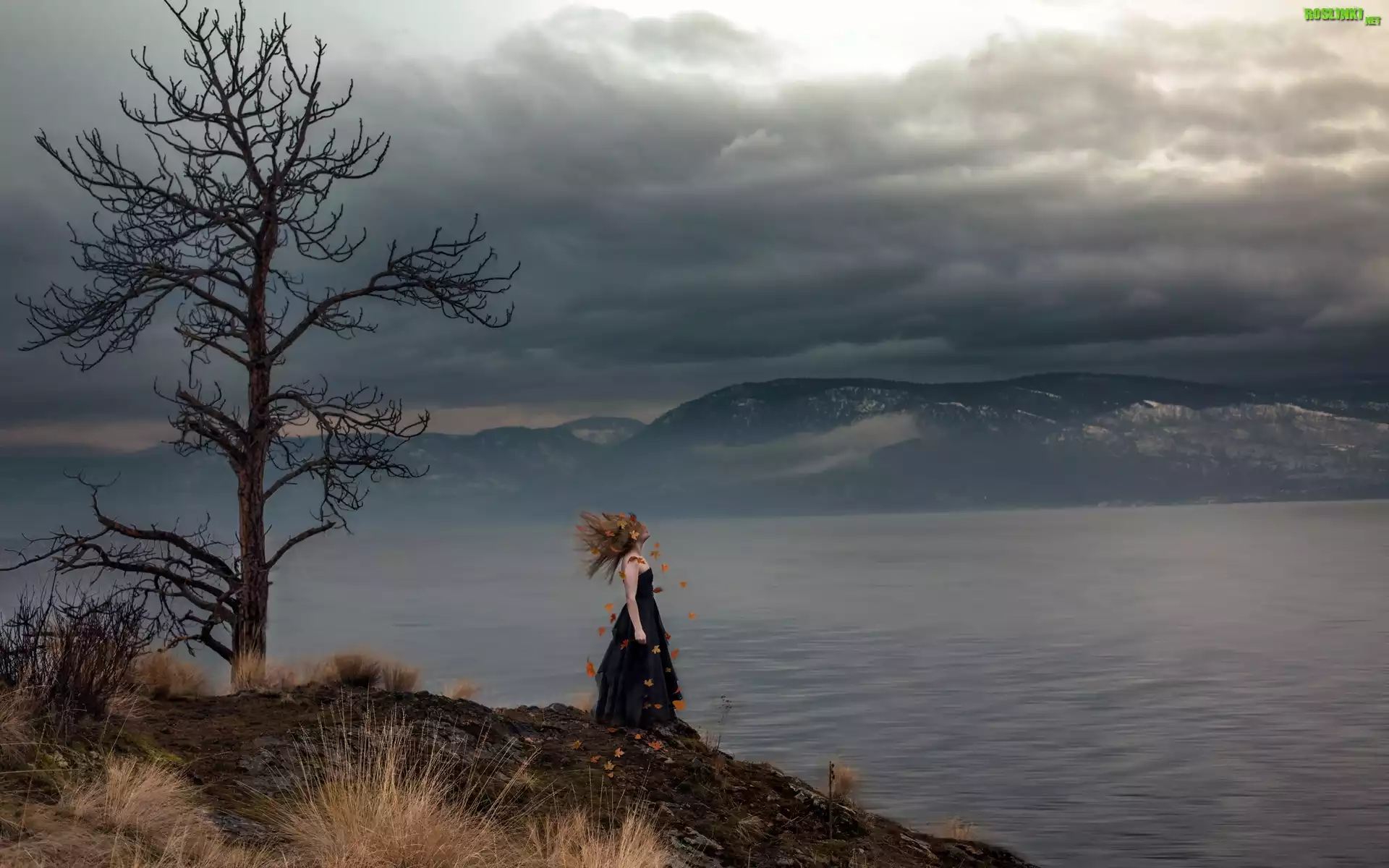 Rośliny: Kobieta, Drzewo, Jezioro, Góry, Ciemne, Chmury, Zmrok