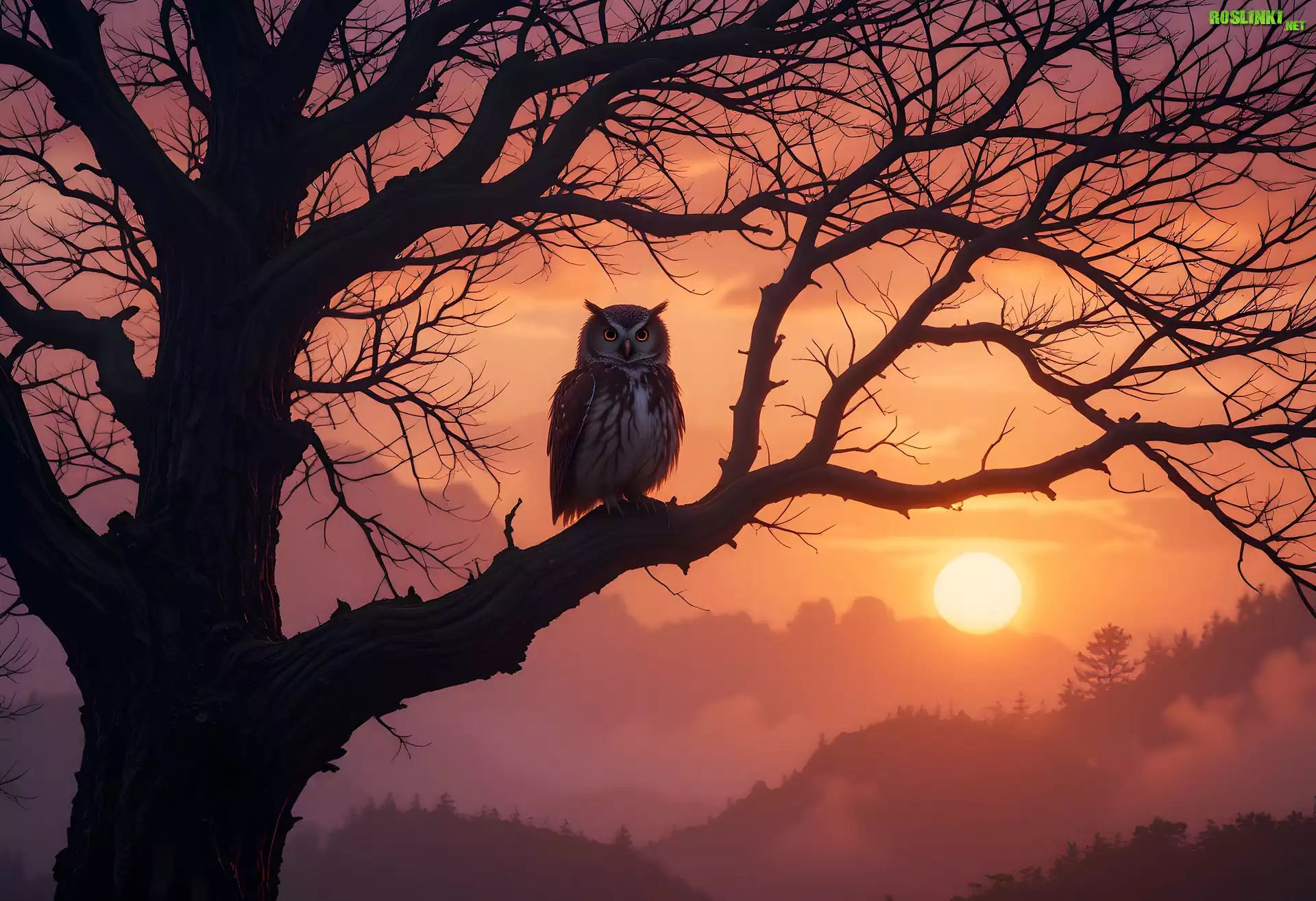Rośliny: Sowa, Drzewo, Konar, Zachód słońca