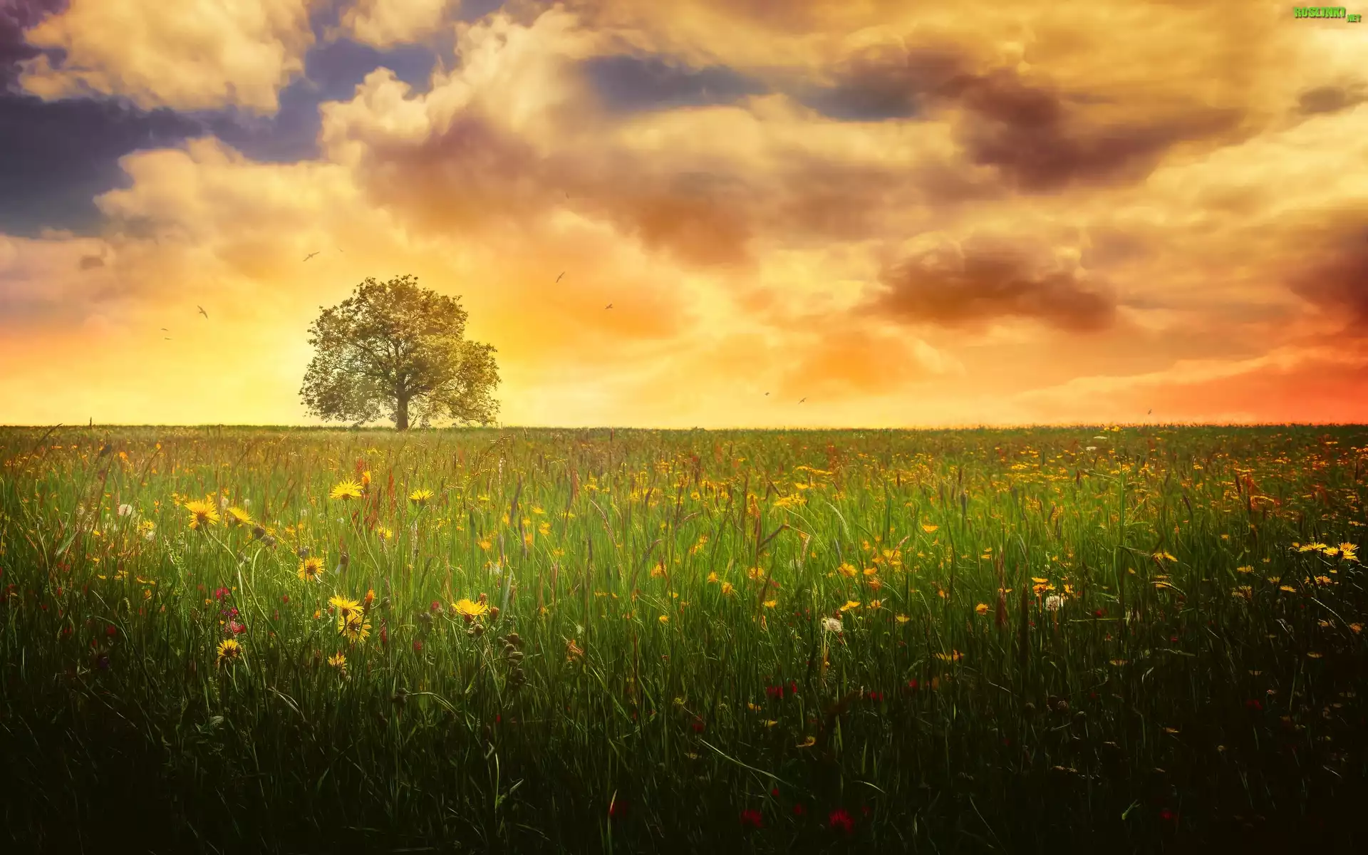 Rośliny: Łąka, Kwiaty, Drzewo, Chmury