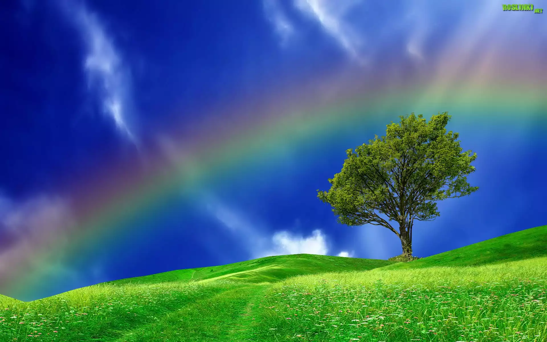 Rośliny: Łąka, Kwiaty, Drzewo, Tęcza