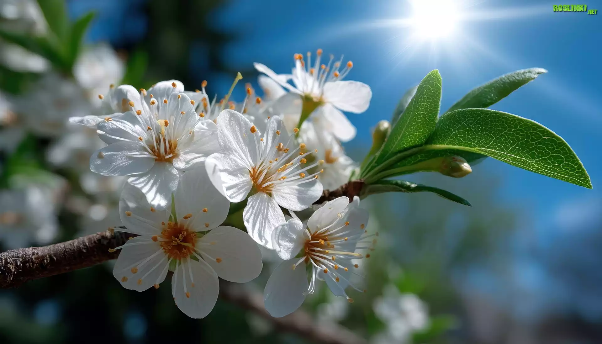 Rośliny: Gałązka, Białe, Kwiaty, Drzewo owocowe, Słońce, Grafika