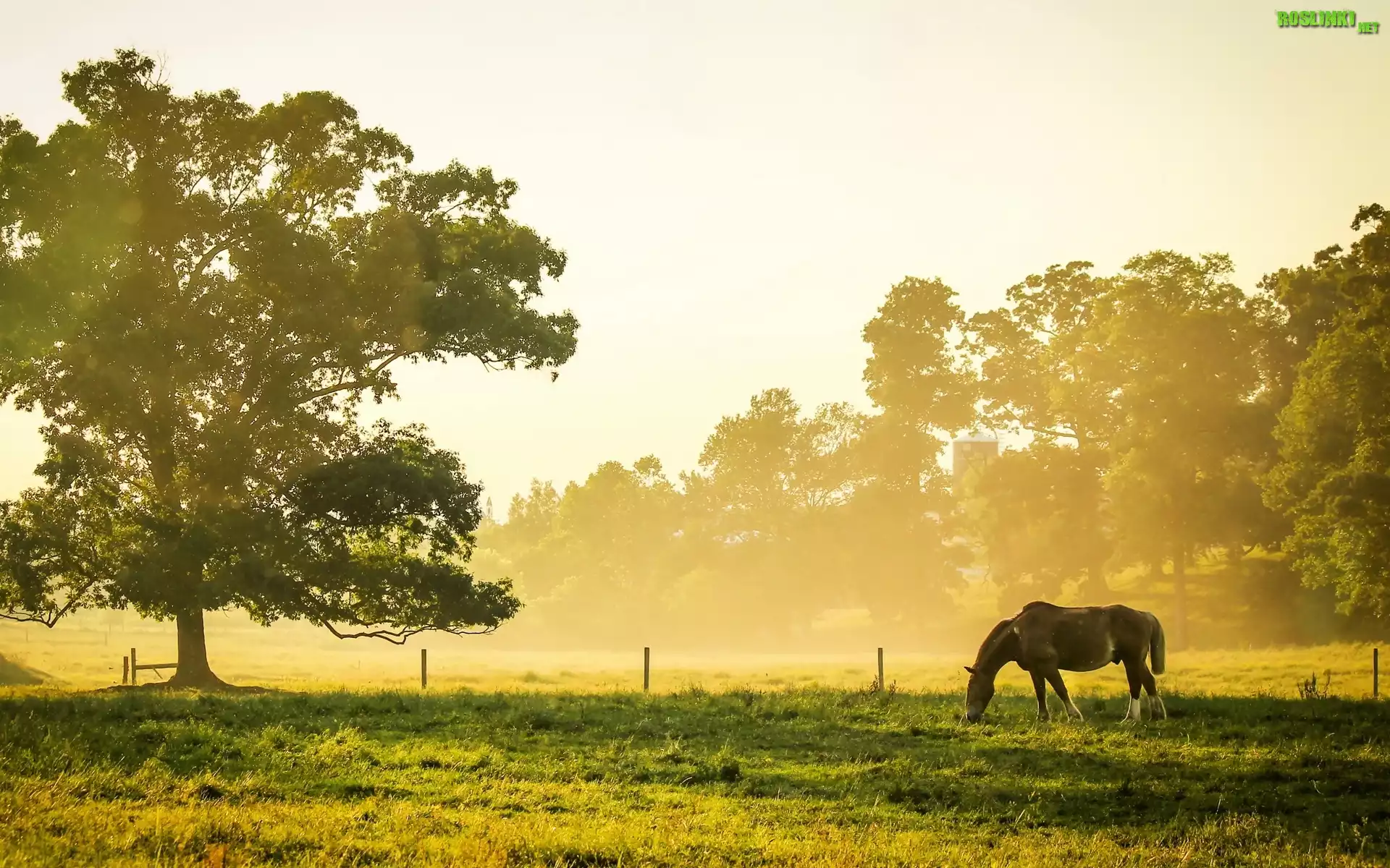 Rośliny: Łąka, Mgła, Drzewo, Koń