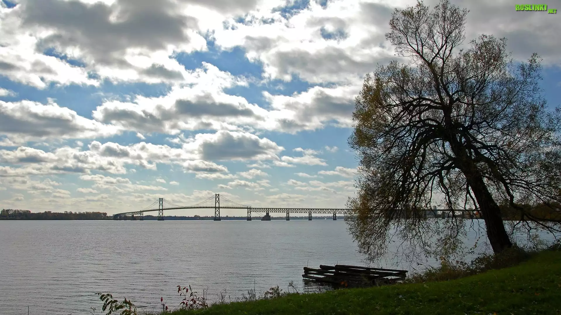 Rośliny: Drzewo, Rzeka, Most, Chmury