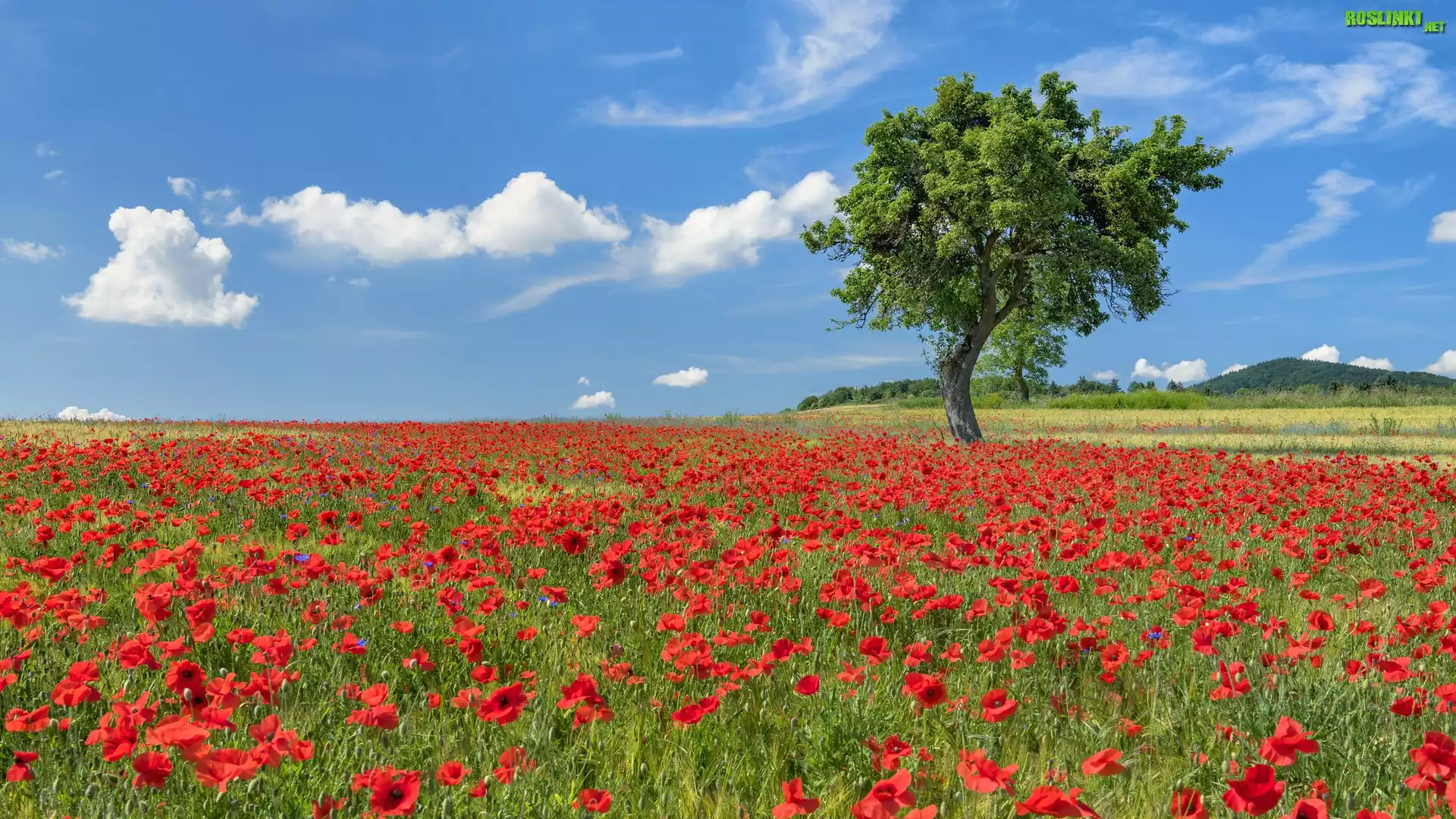 Rośliny: Pole, Czerwone, Maki, Drzewo, Niebo, Obloki