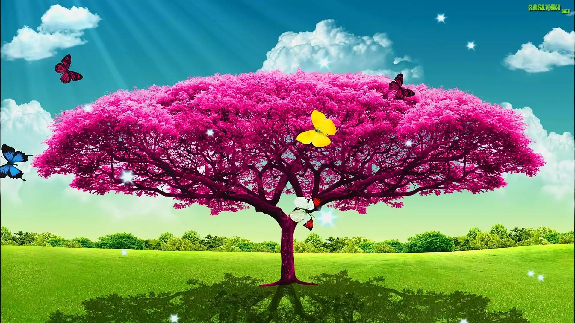 Rośliny: Drzewo, Kolorowe, Motylki, Niebo, Obłoki, Ttrawa