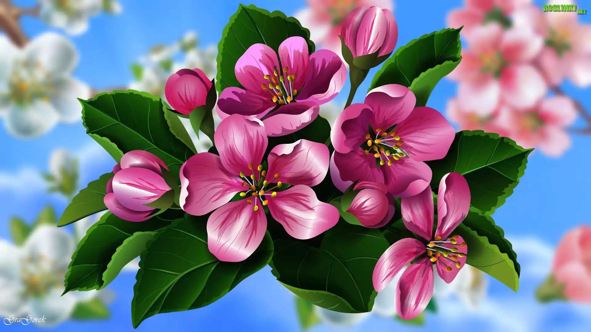 Rośliny: Kwiaty, Drzewo owocowe, Niebo, Grafika