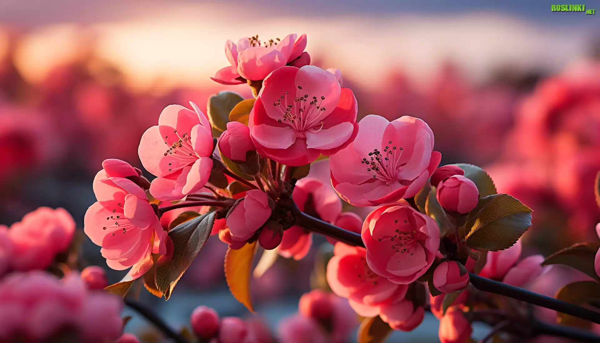 Rośliny: Różowe, Kwiaty, Owocowe, Drzewo, Zachód słońca, Grafika