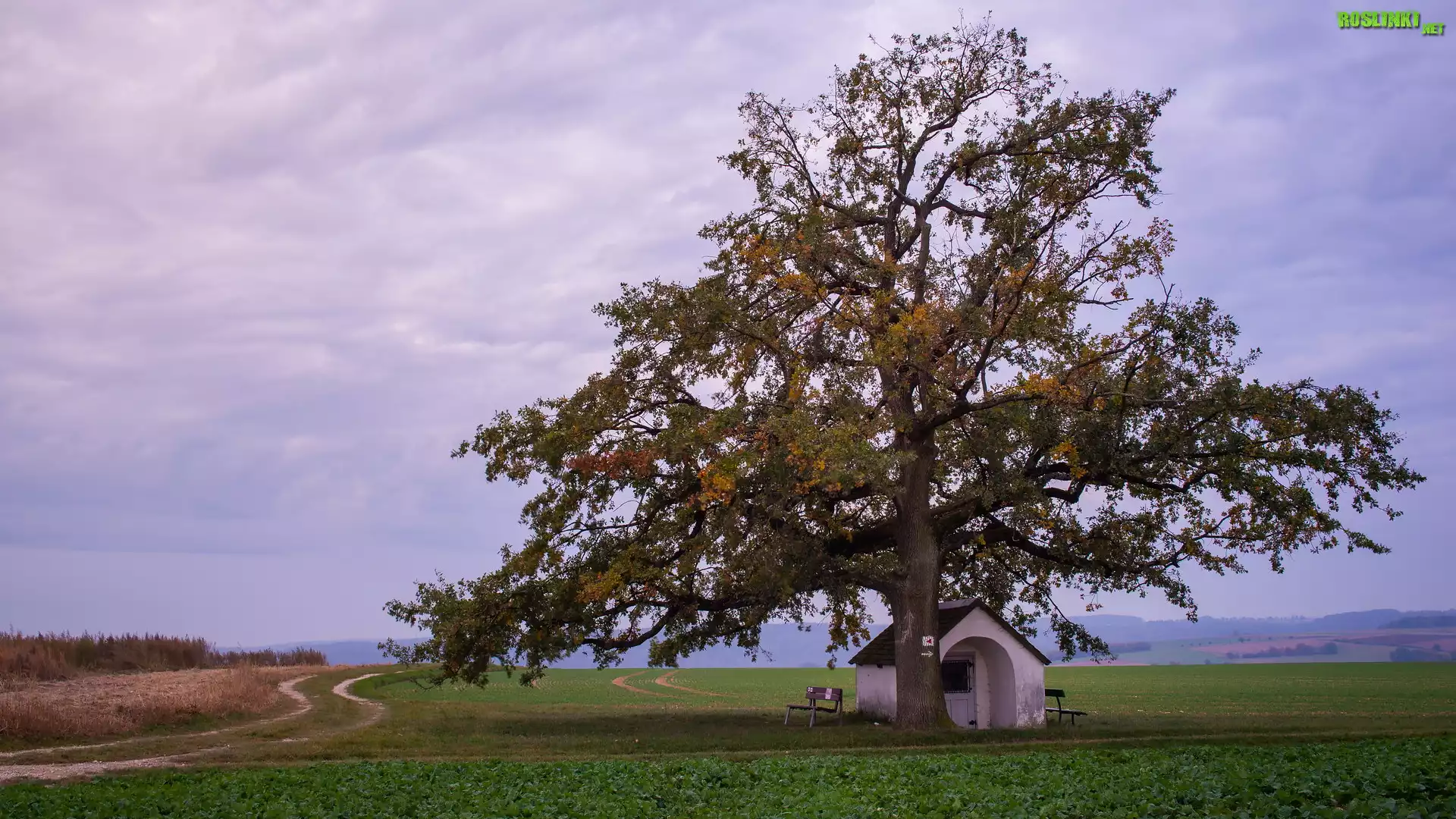 Rośliny: Drzewo, Kapliczka, Ławki, Pola, Droga