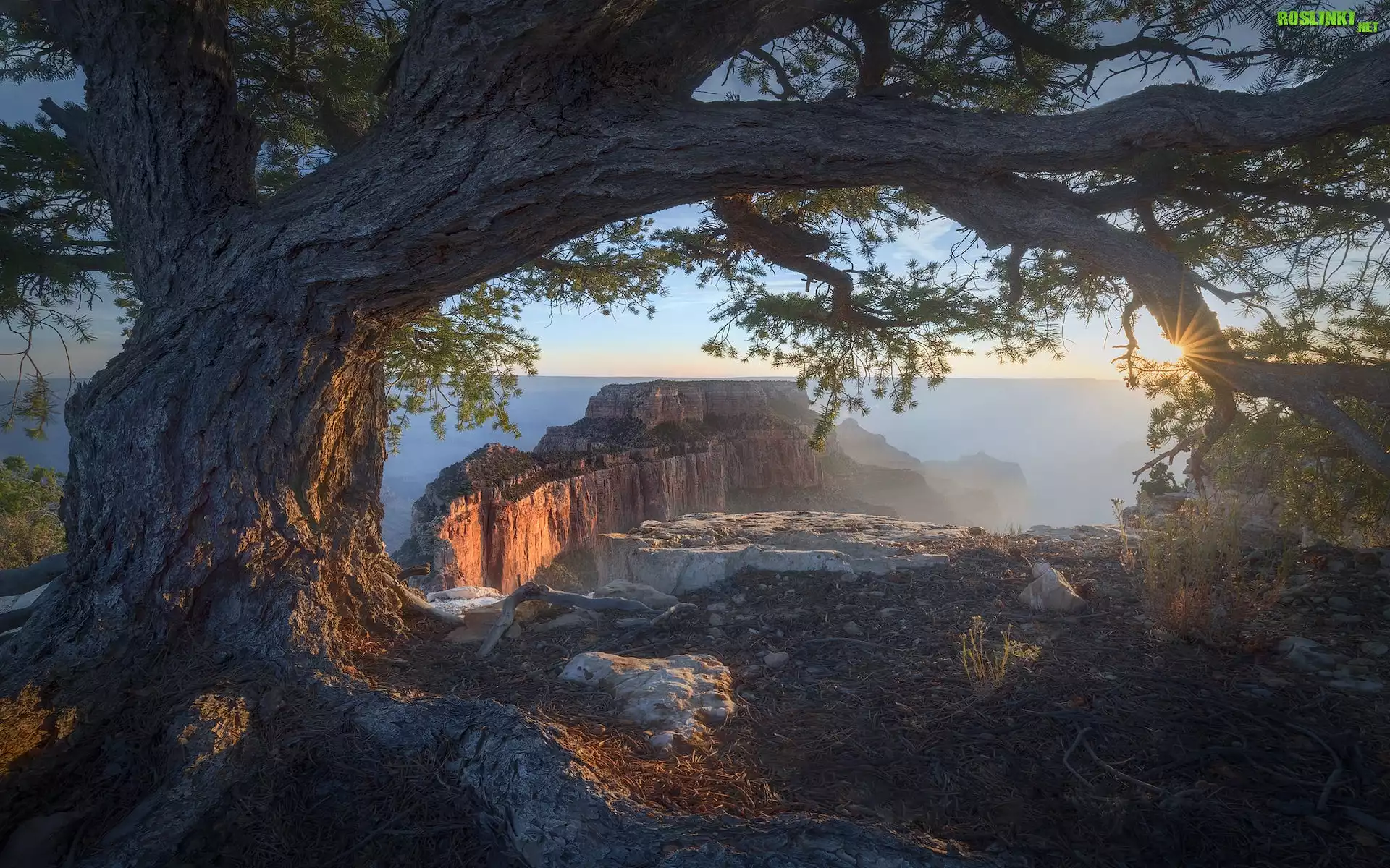 Rośliny: Drzewo, Mgła, Promienie słońca, Skała