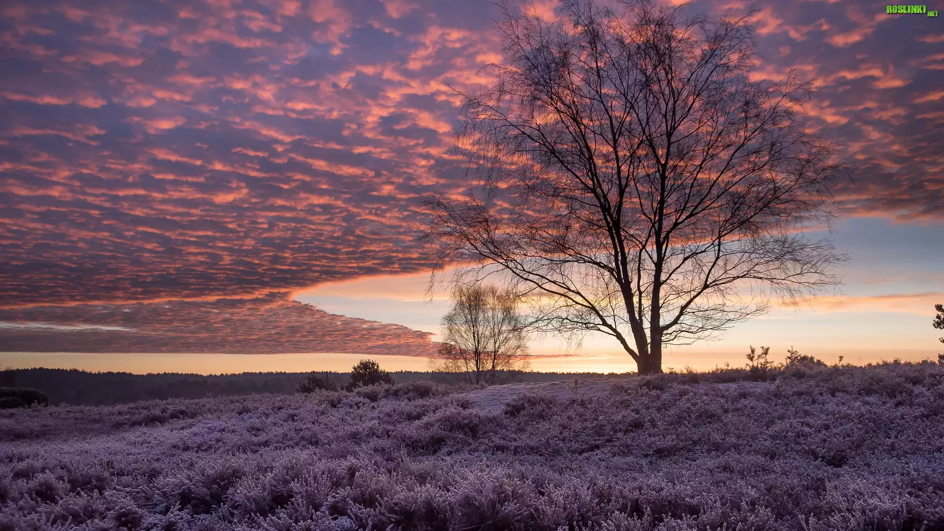 Rośliny: Drzewo, Wrzosowisko, Wrzosy, Zachód słońca, Chmury