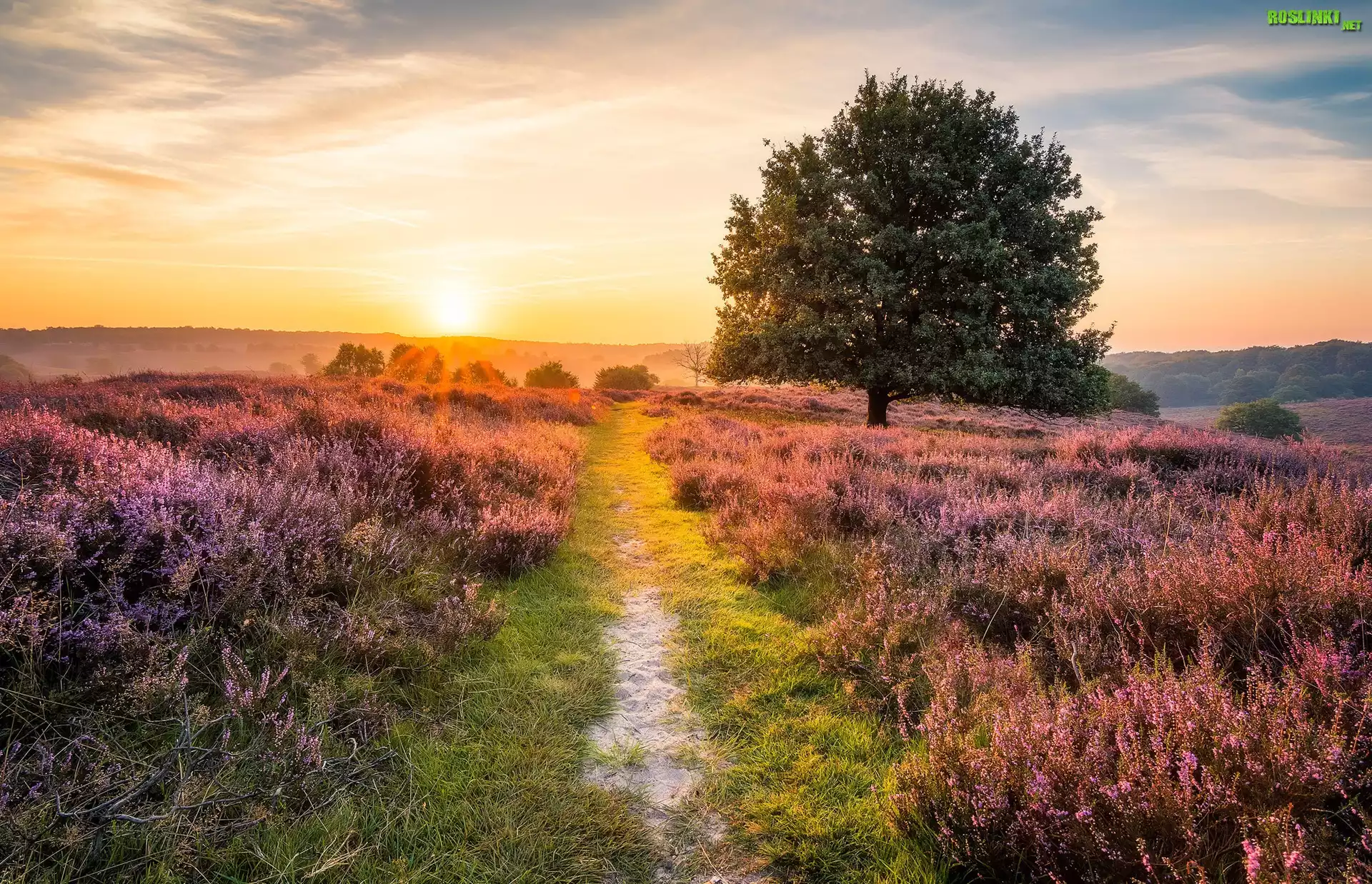 Drzewo, Wrzosowisko, Wschód słońca, Ścieżka