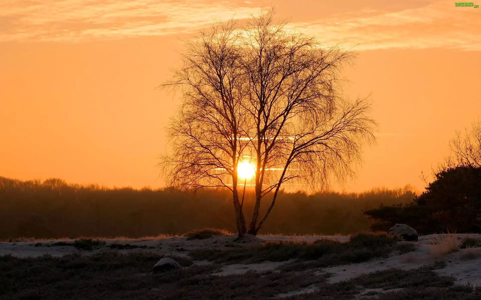 Rośliny: Drzewo, Zachód, Słońca, Śnieg
