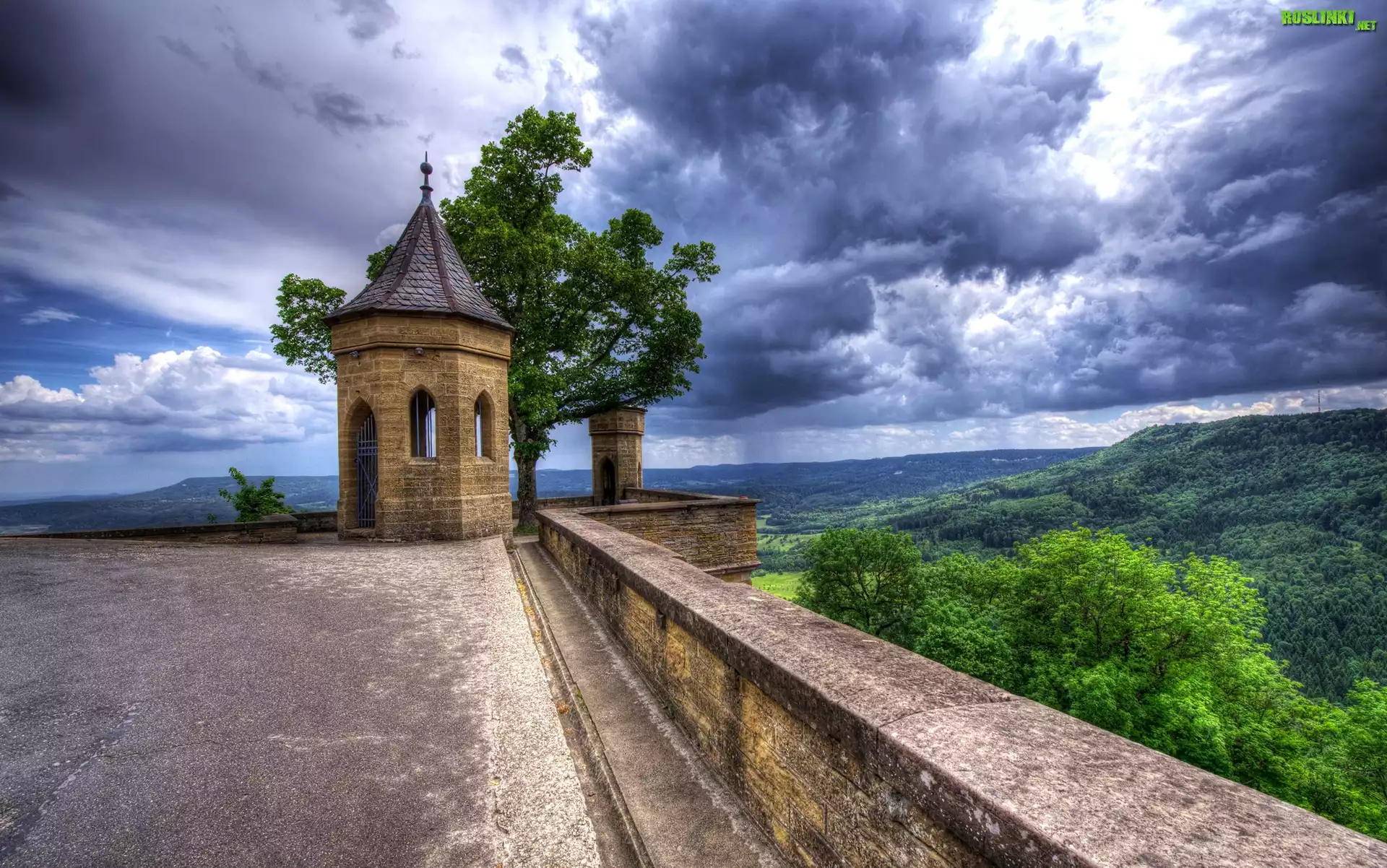 Rośliny: Niemcy, Badenia-Wirtembergia, Zamek Hohenzollern, Taras, Widok, Baszta, Drzewo