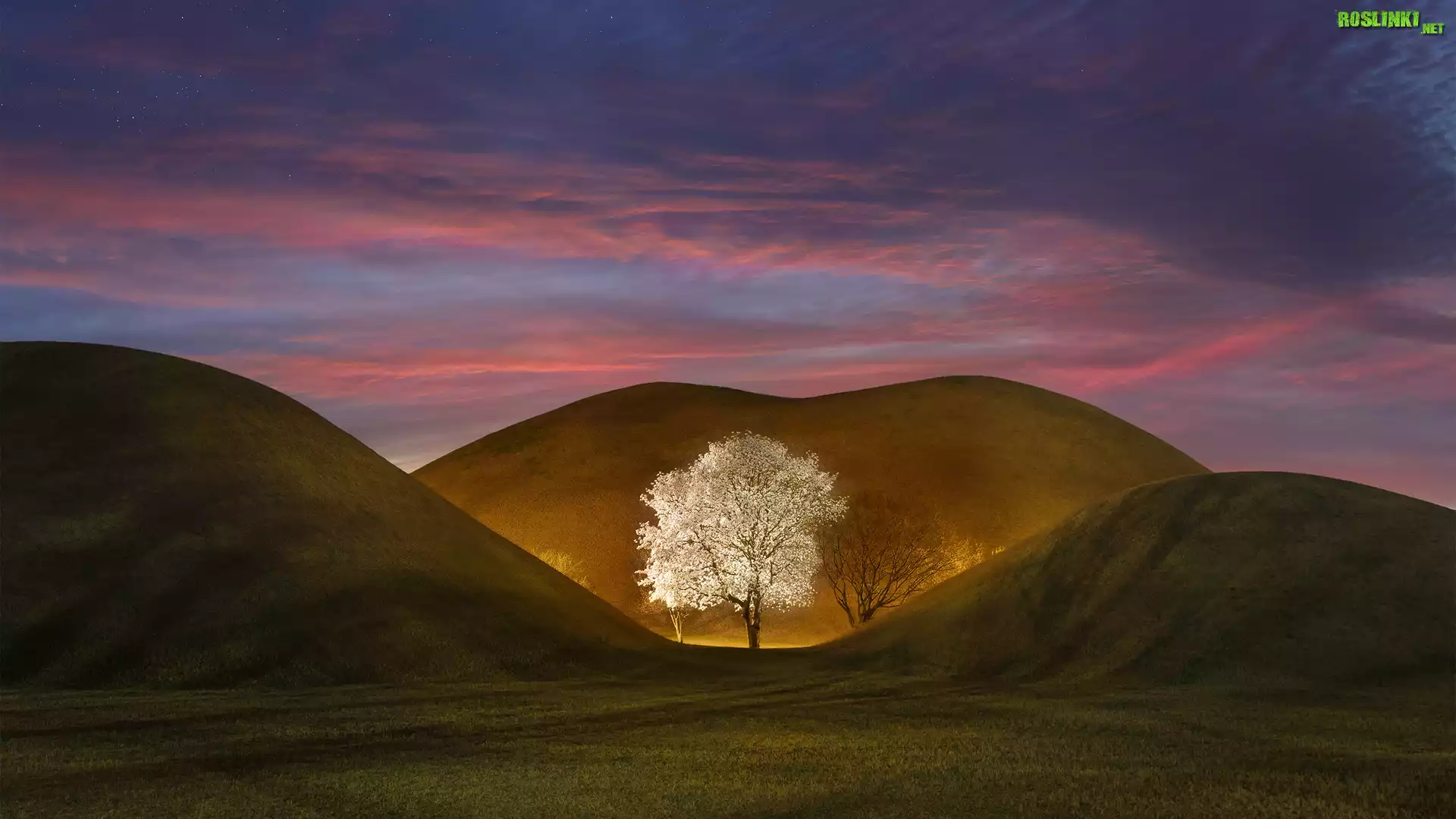 Rośliny: Białe, Drzewo, Wzgórze, Zachód, Słońce