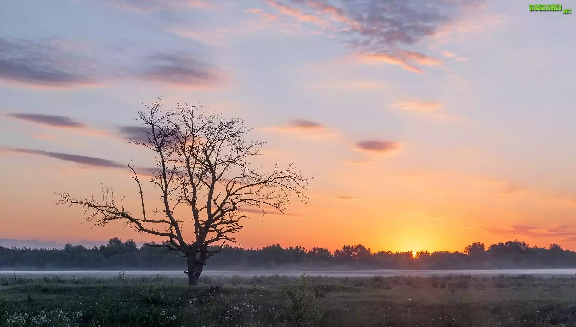 Rośliny: Drzewo, Mgła, Łąka, Zachód słońca