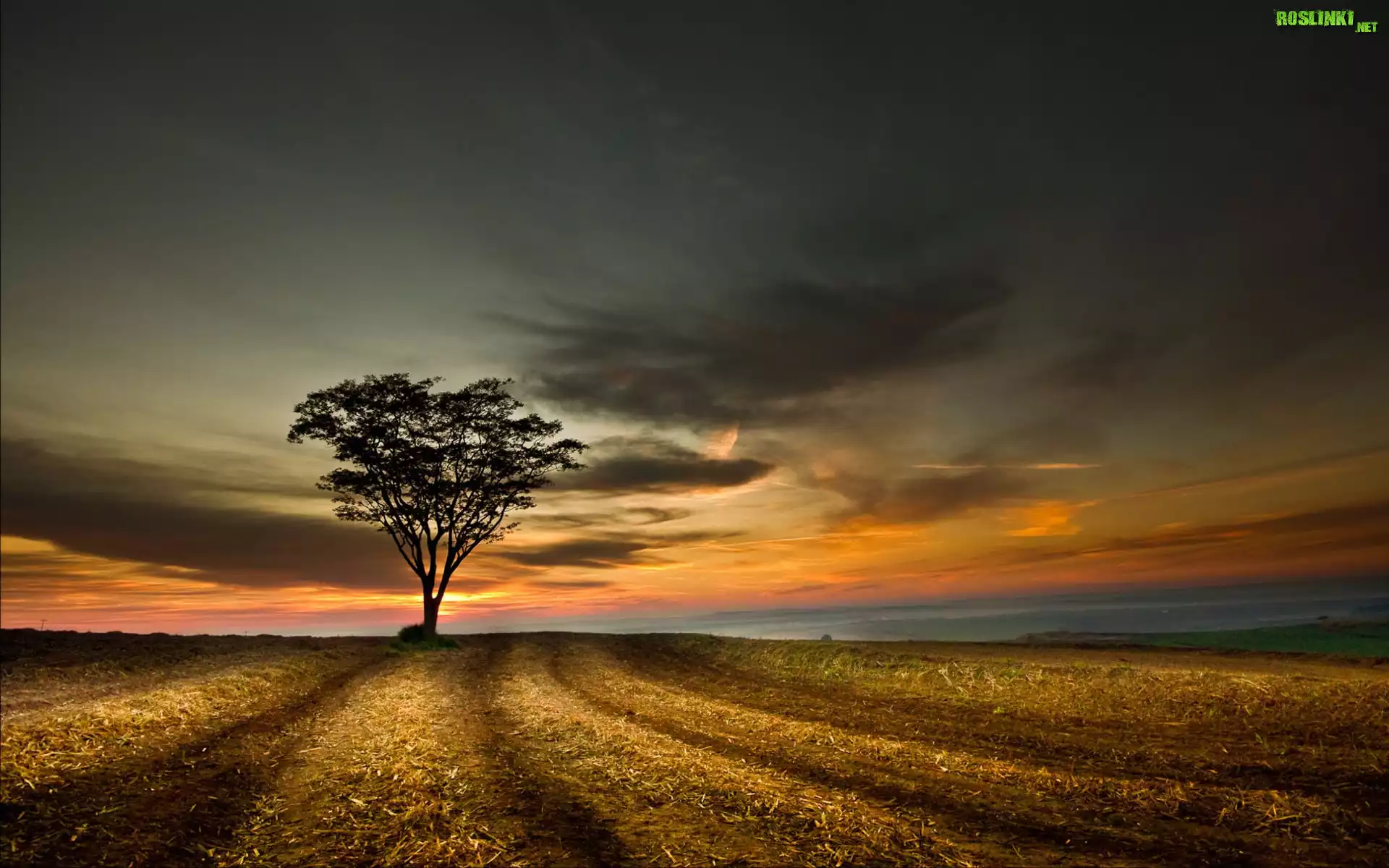 Rośliny: Drzewo, Pola, Chmury, Zachód, Słońca