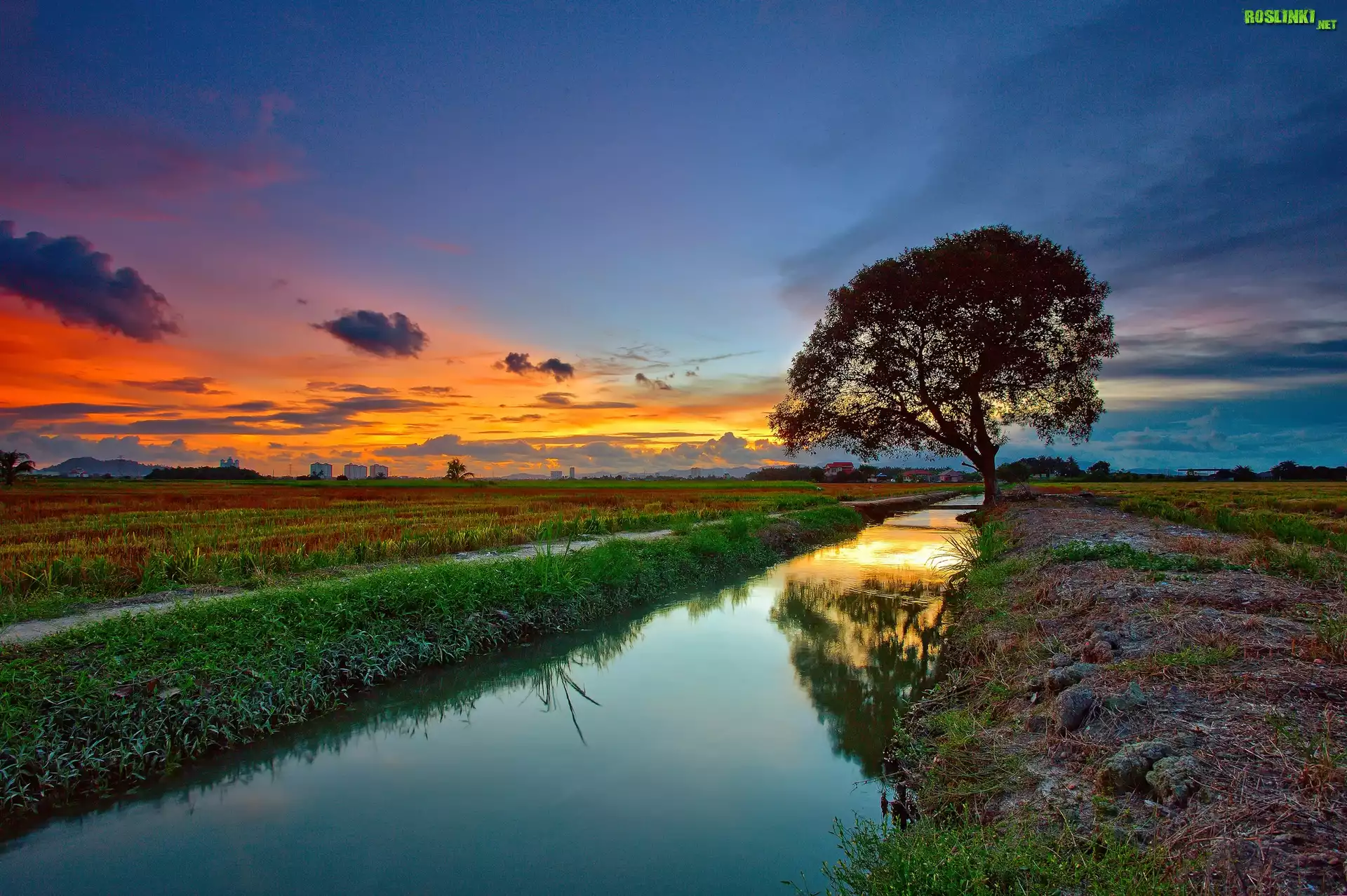 Rośliny: Drzewo, Rzeka, Odbicie, Pole, Zachód, Słońca