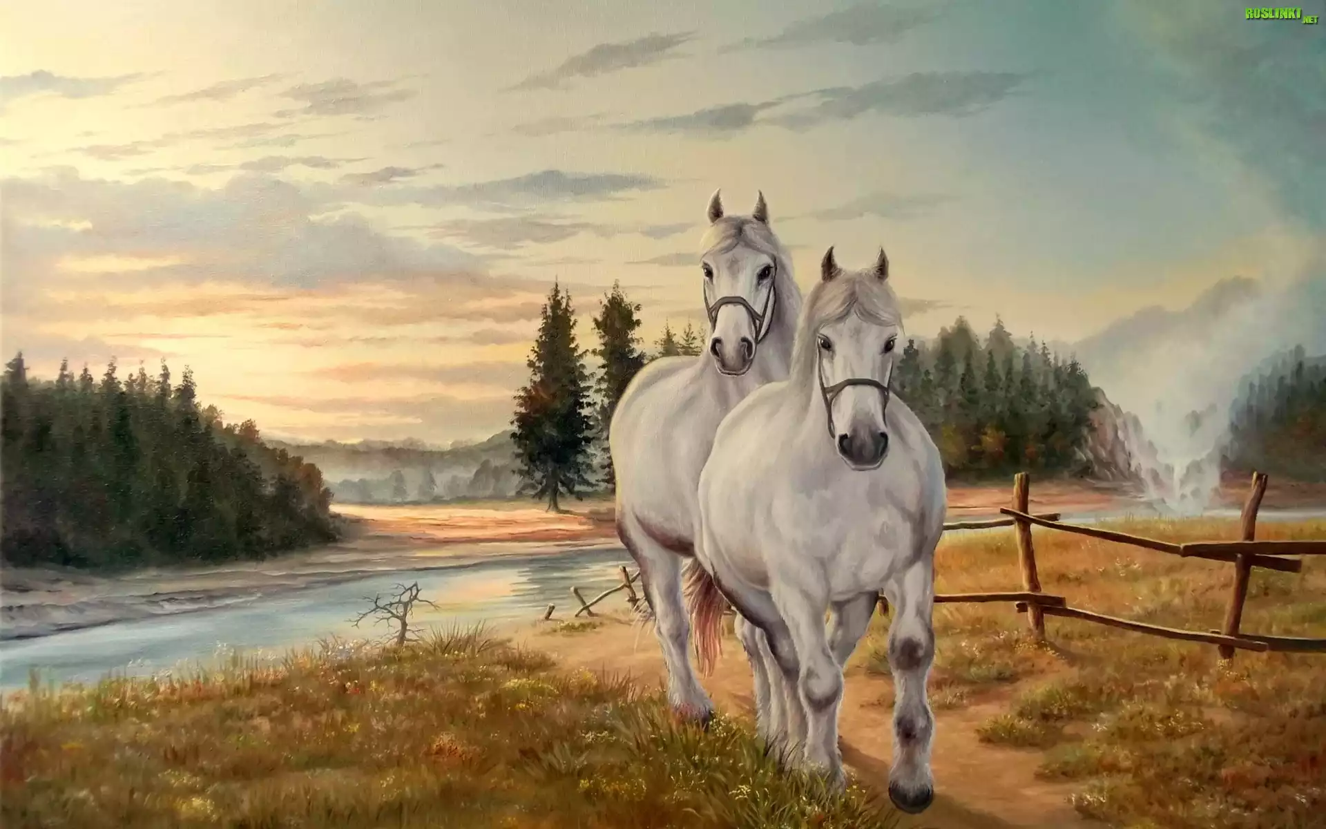 Rośliny: Dwa, Białe, Konie, Rzeka, Pastwisko, Drzewa