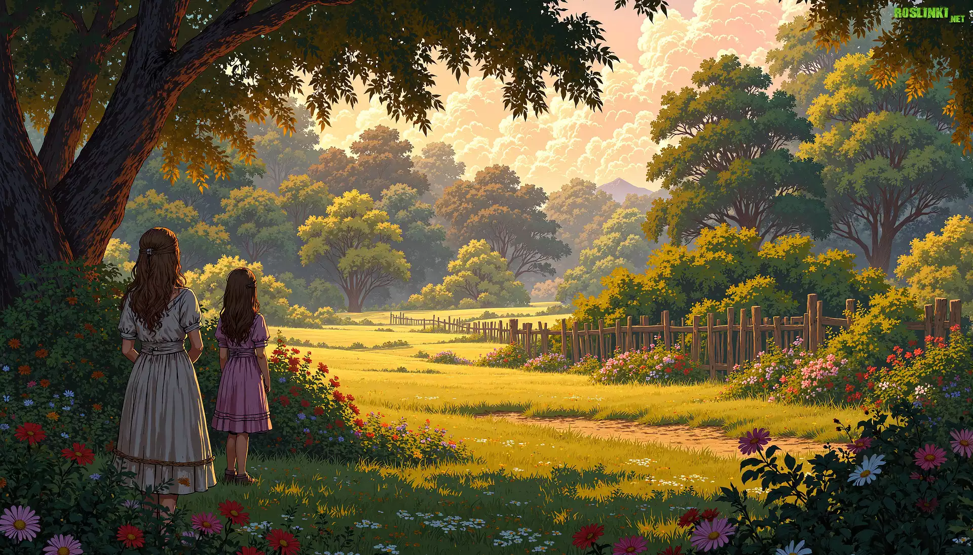 Rośliny: Łąka, Kwiaty, Drzewa, Dwie, Dziewczynki, Ogrodzenie, Grafika