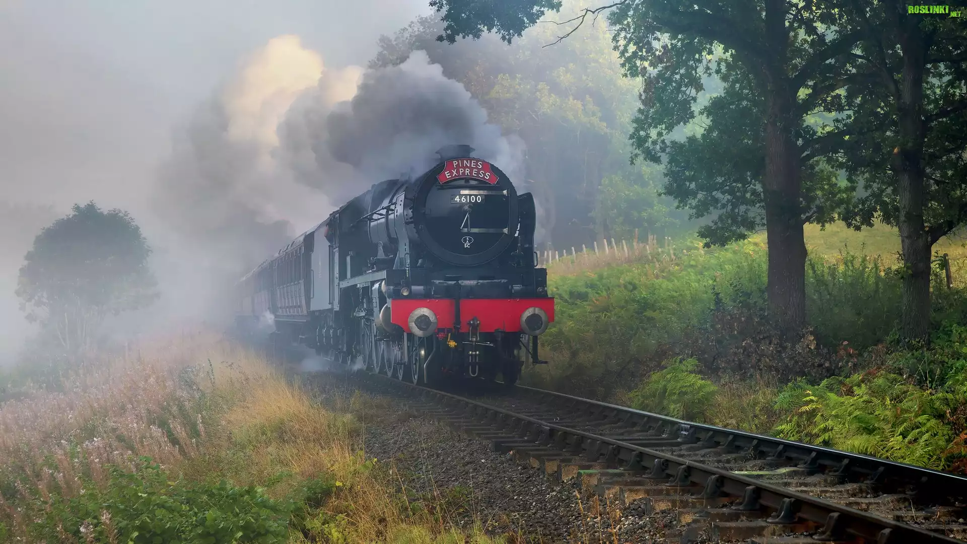 Rośliny: Pociąg parowy, Szyny, Dym, Drzewa, Rośliny