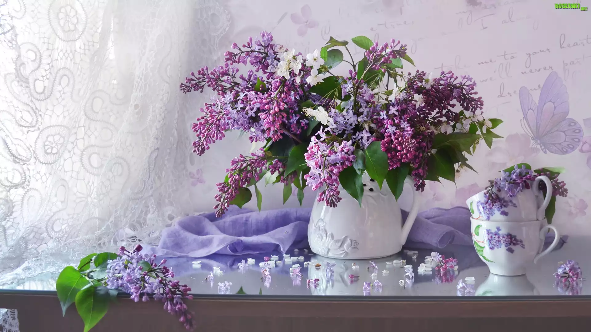 Rośliny: Kompozycja, Dzbanek, Fioletowy, Bez, Bukiet, Filiżanki, Firanka