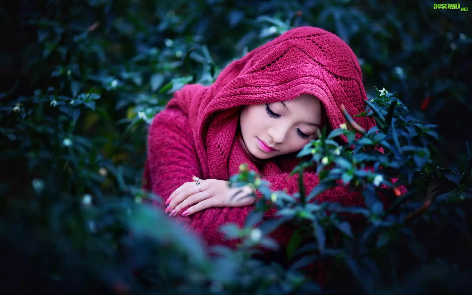 Rośliny: Smutna, Dziewczyna, Szal, Makijaż, Biżuteria, Kwitnący, Krzew