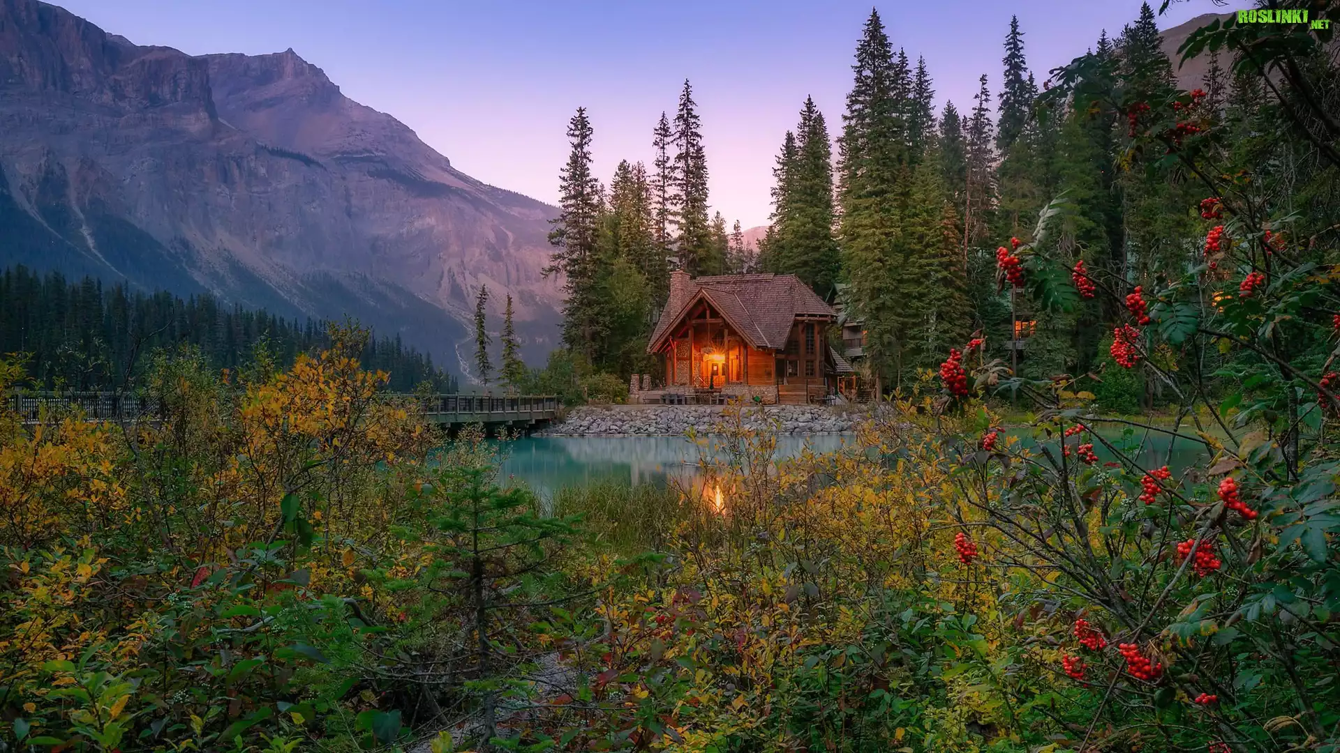 Rośliny: Kanada, Park Narodowy Yoho, Góry, Jezioro, Emerald Lake, Drzewa, Jesień, Dom