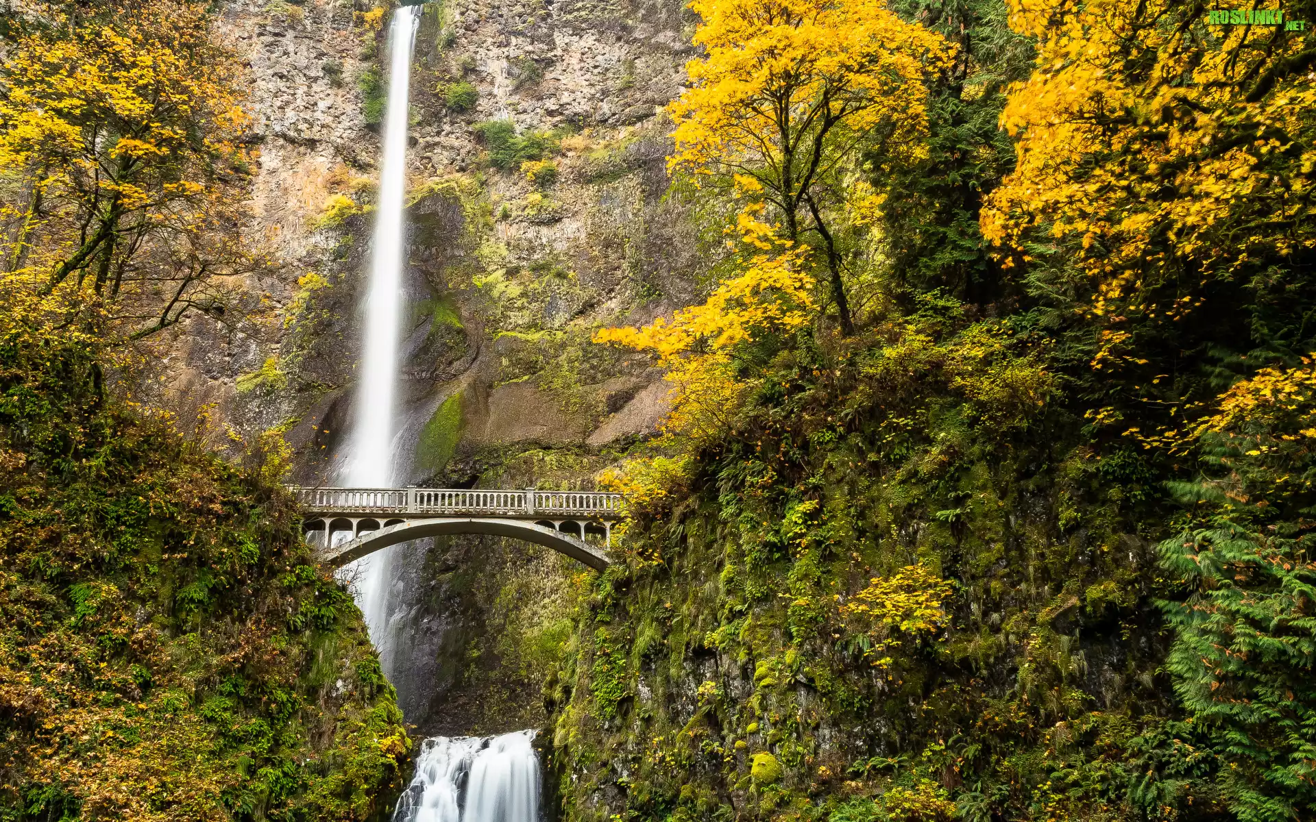 Rośliny: Wodospad, Multnomah Falls, Most, Drzewa, Las, Jesień, Stan Oregon, Stany Zjednoczone