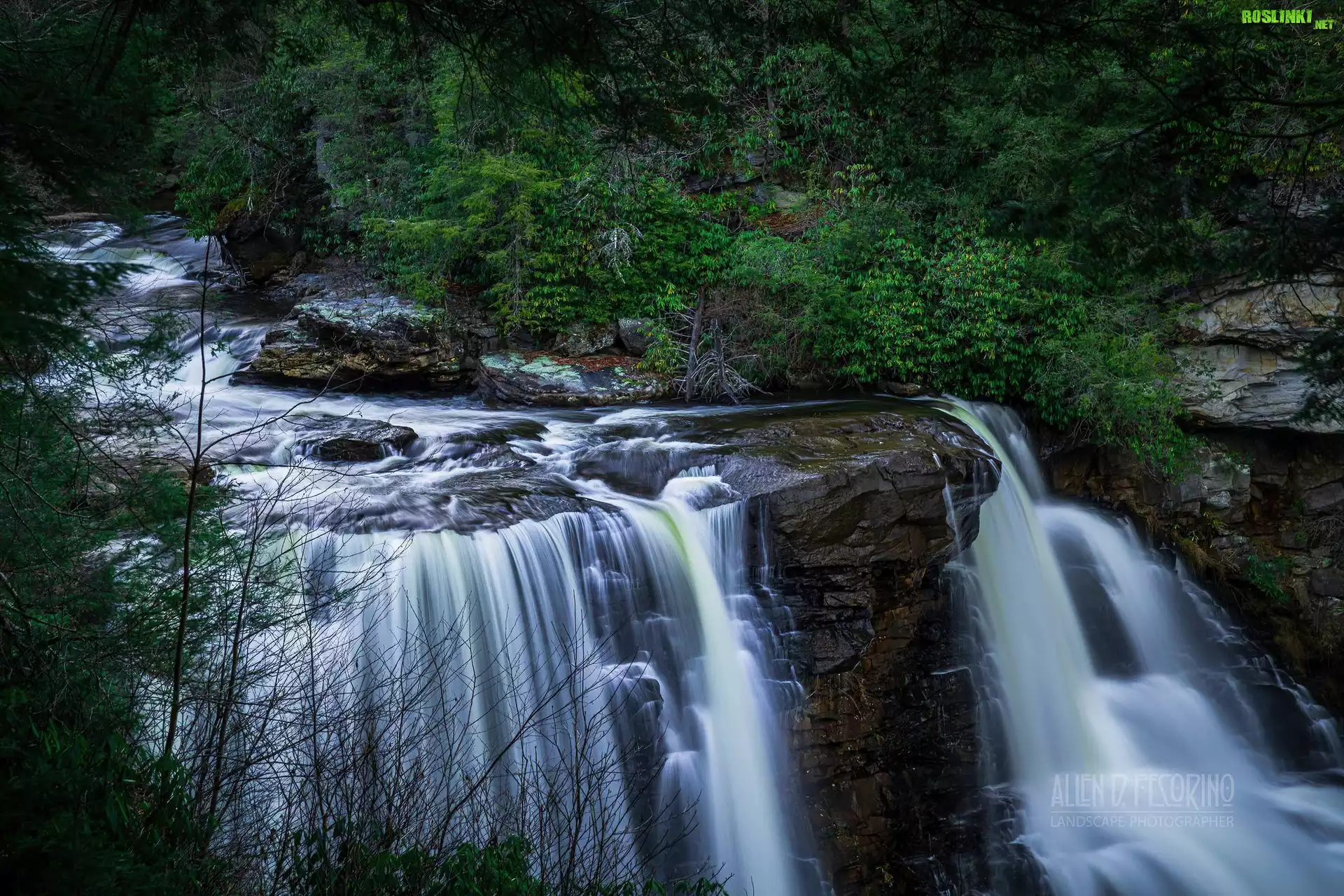 Stany Zjednoczone, Wirginia Zachodnia, Park Stanowy Blackwater Falls, Wodospad, Blackwater Falls, Kaskada, Skały, Drzewa, Roślinność |