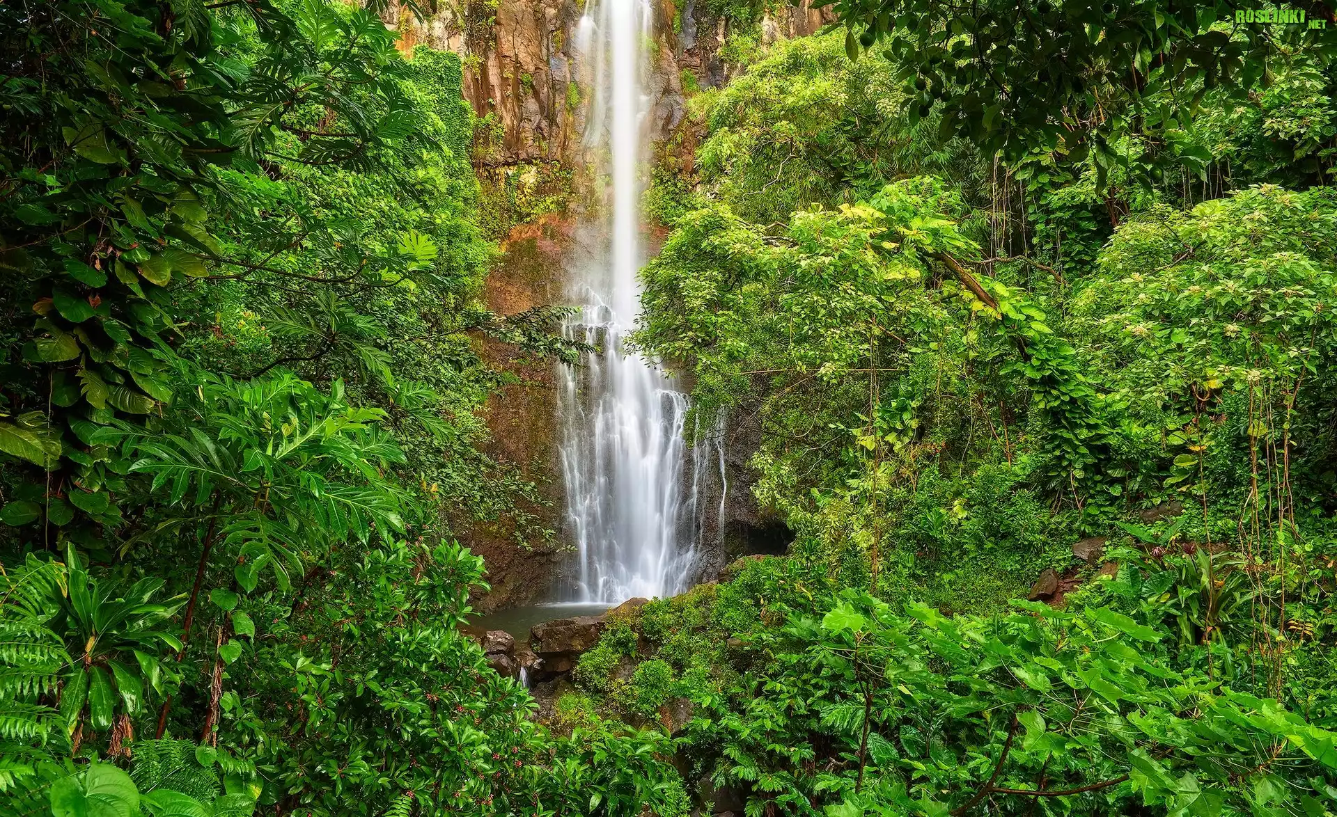 Wodospad Waimoku Falls, Park Narodowy Haleakala, Wyspa Maui, Hawaje, Drzewa, Roślinność