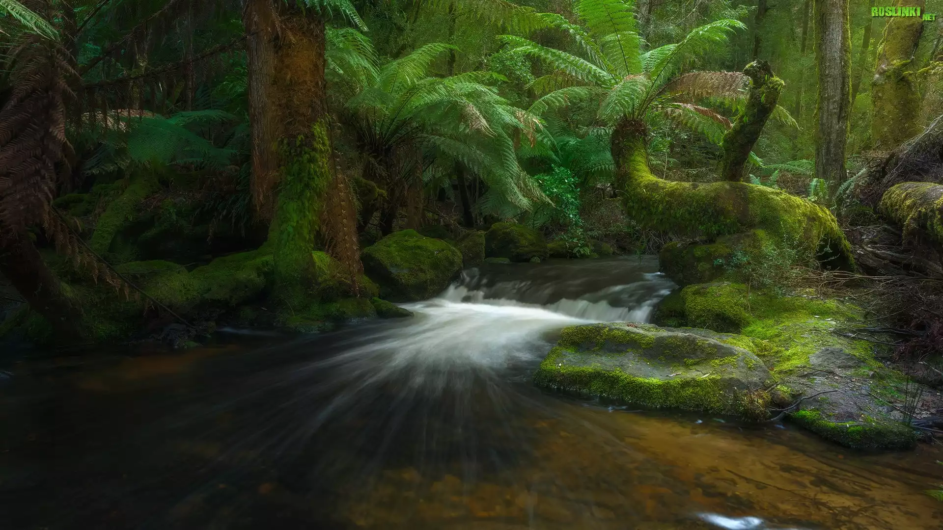 Rośliny: Australia, Tasmania, Park Narodowy Mount Field, Las deszczowy, Drzewa, Paprocie, Rzeka, Strumień