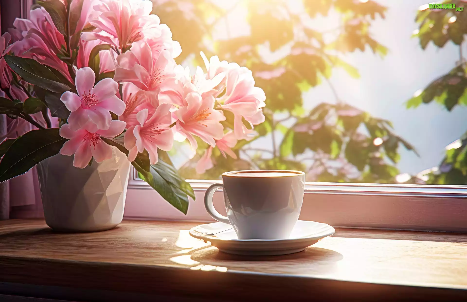Rośliny: Azalia, Kwiaty, Bukiet, Filiżanka, Okno, Grafika