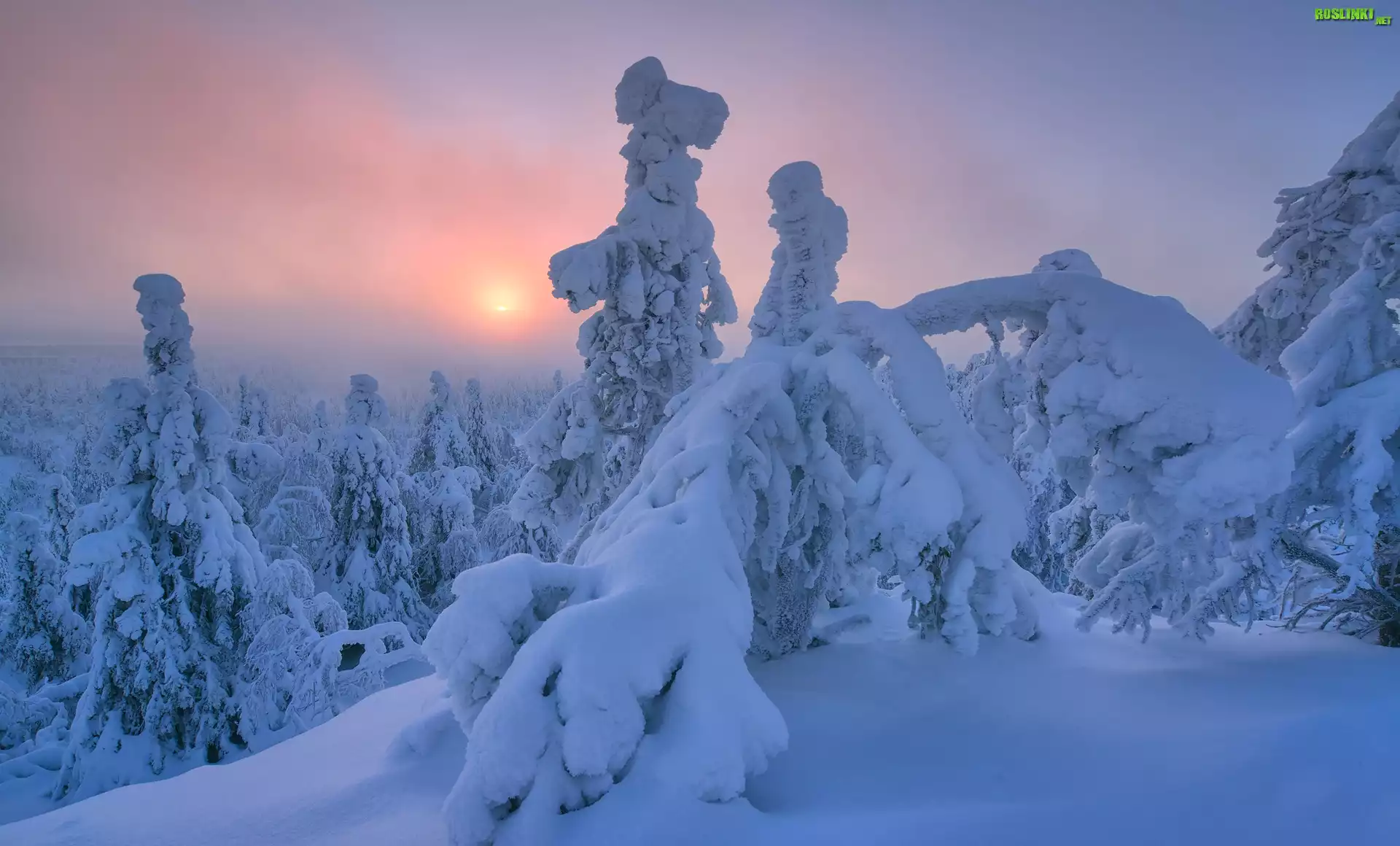 Rośliny: Zima, Drzewa, Mgła, Wschód słońca, Wzgórze, Rezerwat Valtavaara, Laponia, Finlandia