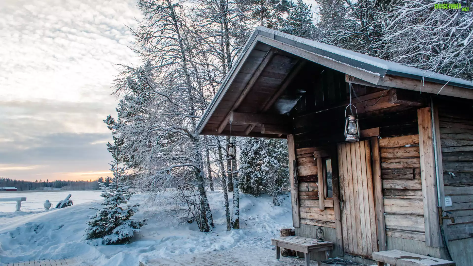 Rośliny: Finlandia, Lemmoncarks, Budowla, Sauna, Ośnieżone, Drzewa, Jezioro Payanne, Zima, Śnieg