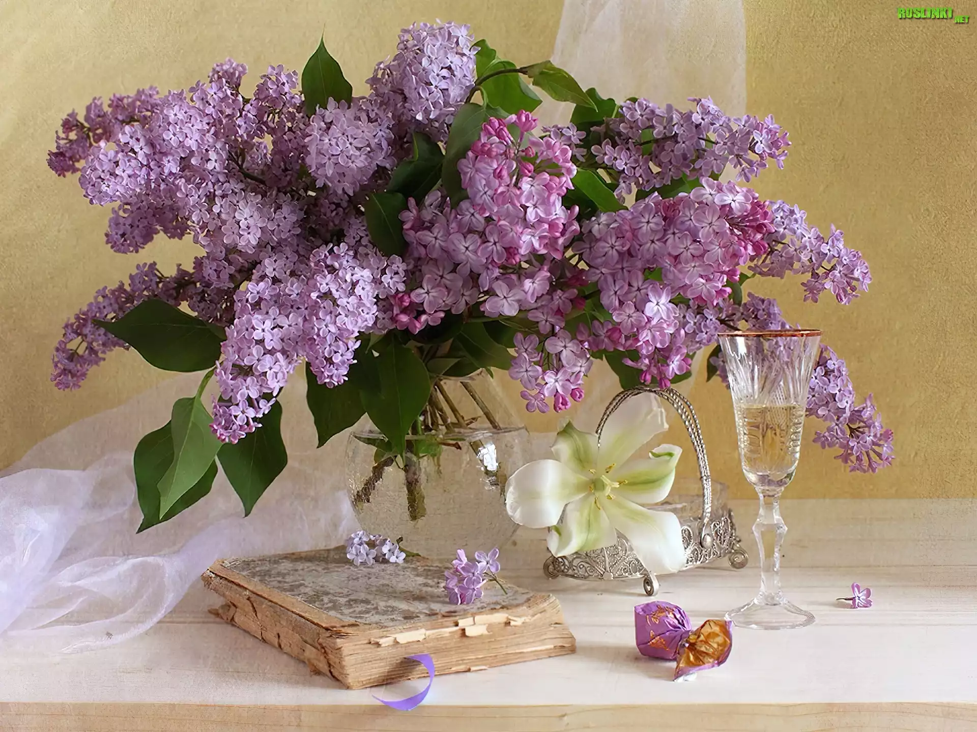 Rośliny: Fioletowy, Bez, Stara, Książka, Kieliszek, Wina