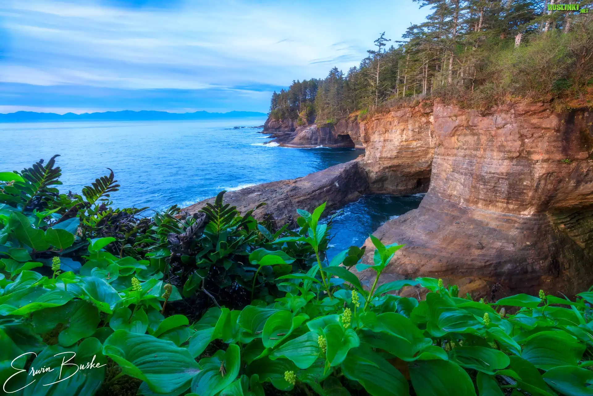 Rośliny: Stany Zjednoczone, Waszyngton, Wybrzeże, Klif, Przylądek Flattery, Skały, Drzewa, Liście, Morze
