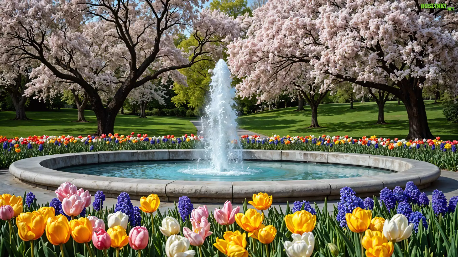 Rośliny: Wiosna, Park, Kwiaty, Fontanna, Kwitnące, Drzewa