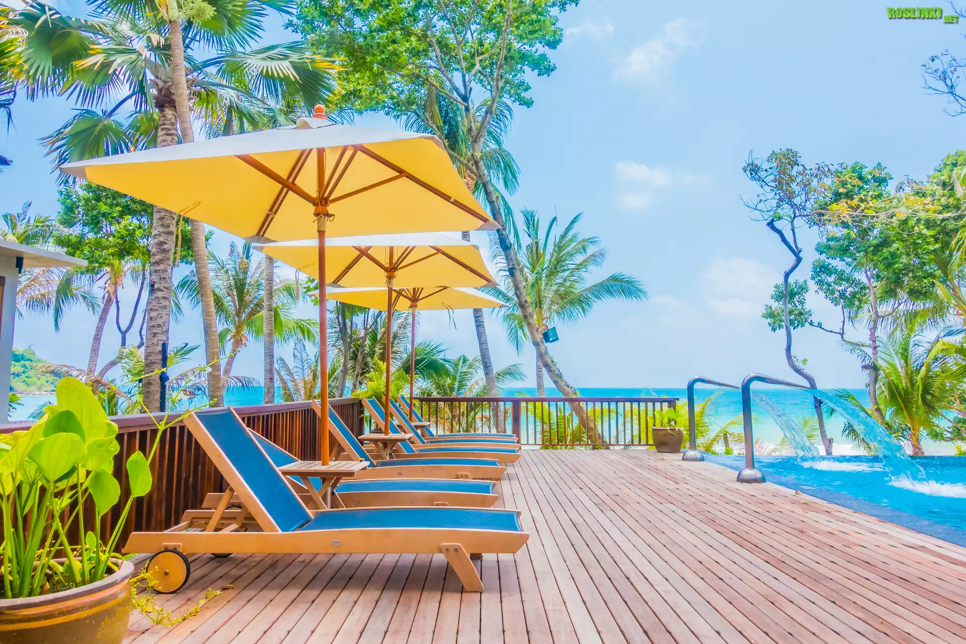 Rośliny: Lato, Basen, Taras, Fotele, Parasole, Palmy