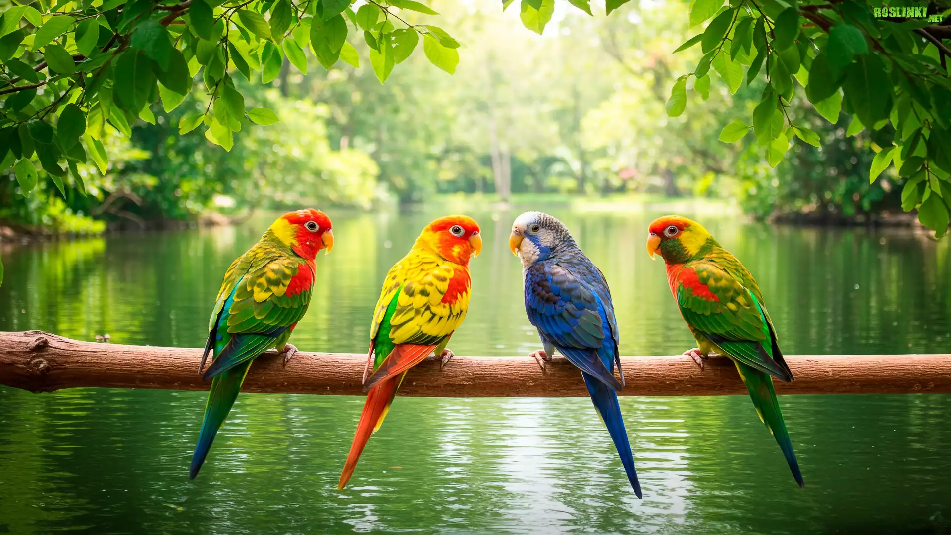 Papugi, Cztery, Kolorowe, Gałąź, Woda, Drzewa
