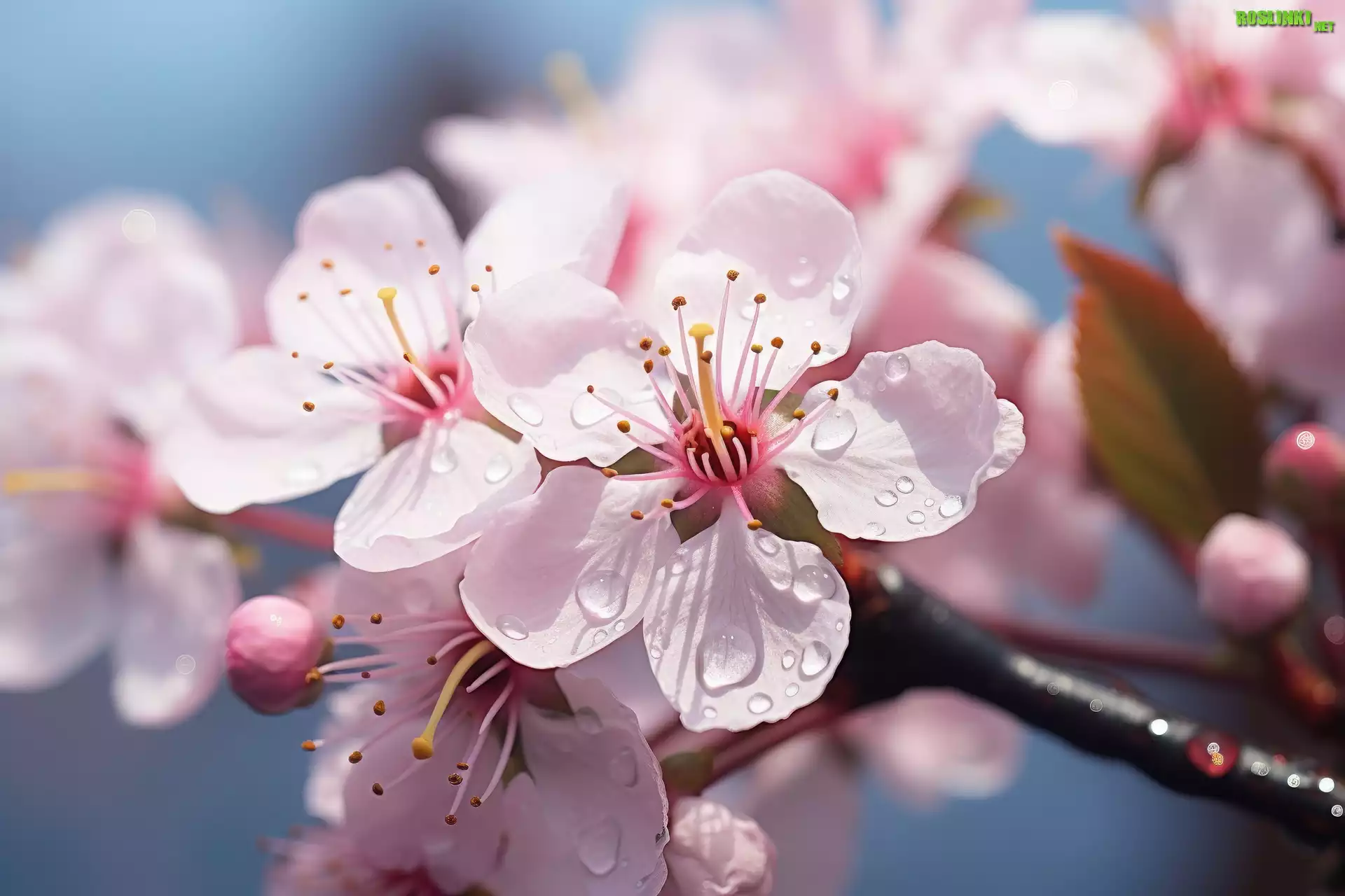 Rośliny: Różowe, Kwiaty, Krople, Gałąź, Drzewo owocowe, Zbliżenie