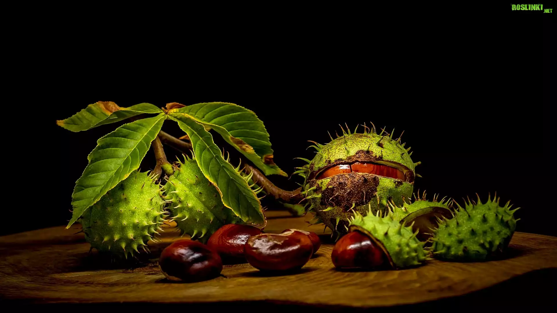 Rośliny: Kasztanowiec, Gałązka, Liście, Kasztany, Łupiny, Ciemne tło