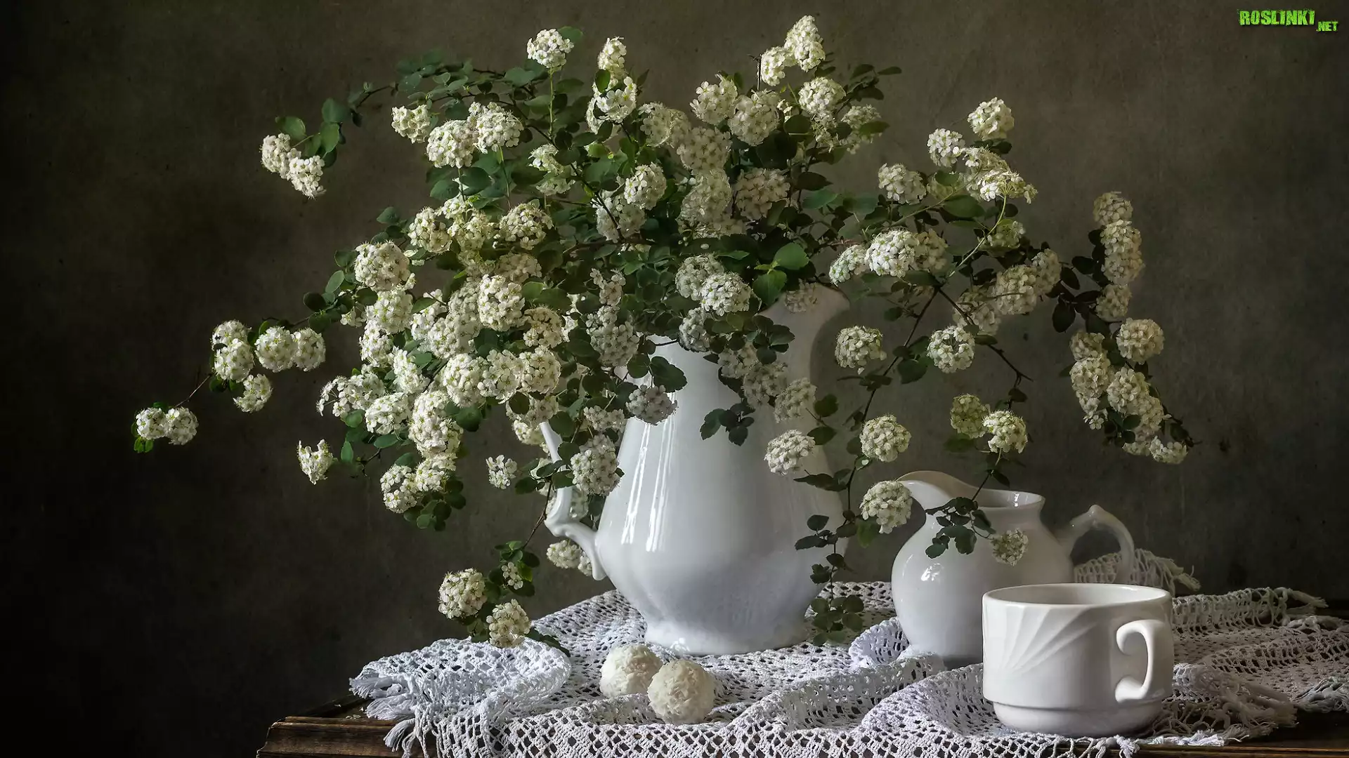Rośliny: Kwiaty, Białe, Tawuła, Gałązki, Dzbanek, Filiżanka, Serweta