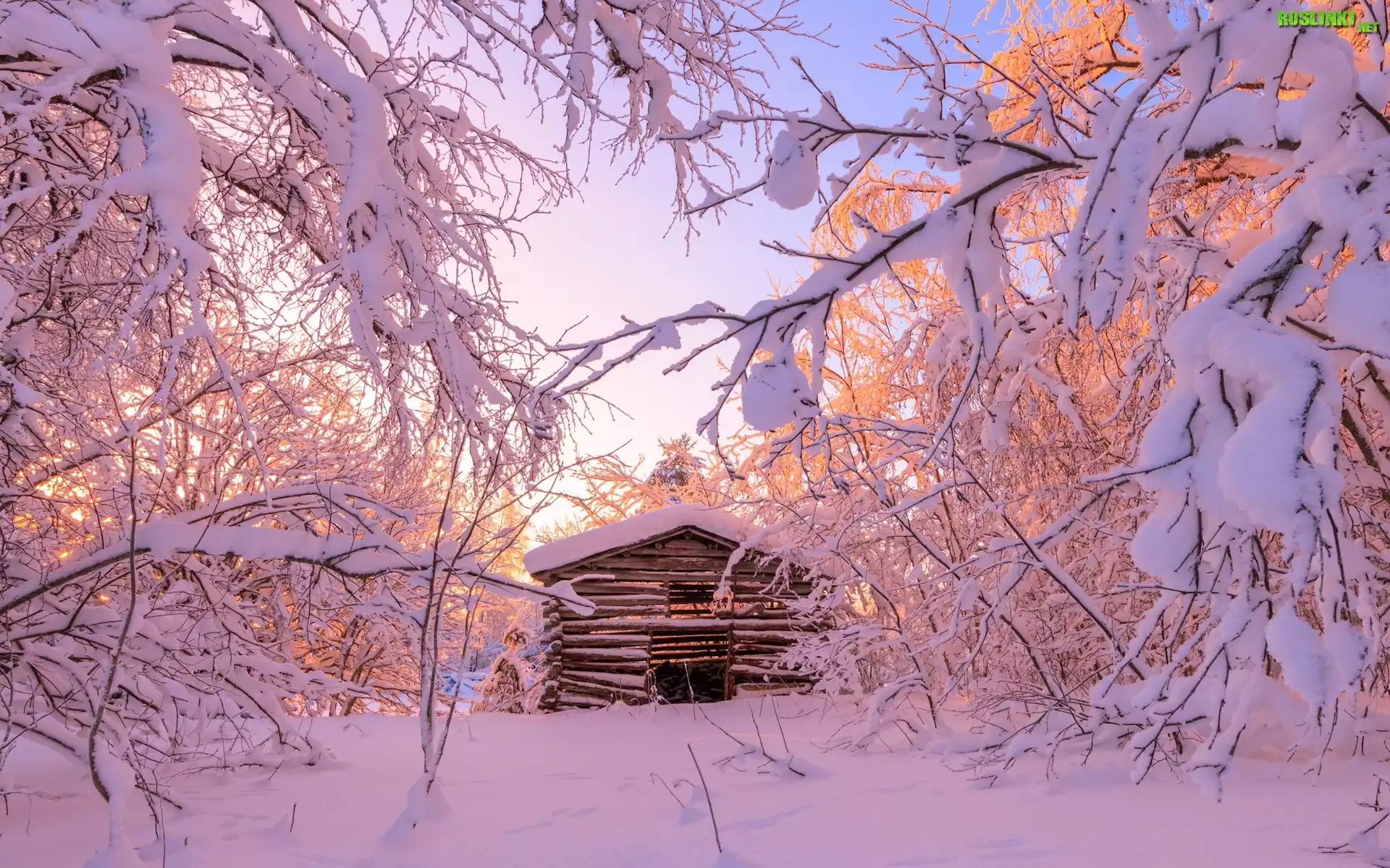 Rośliny: Zima, Drzewa, Ośnieżone, Gałęzie, Szopa, Drewniana