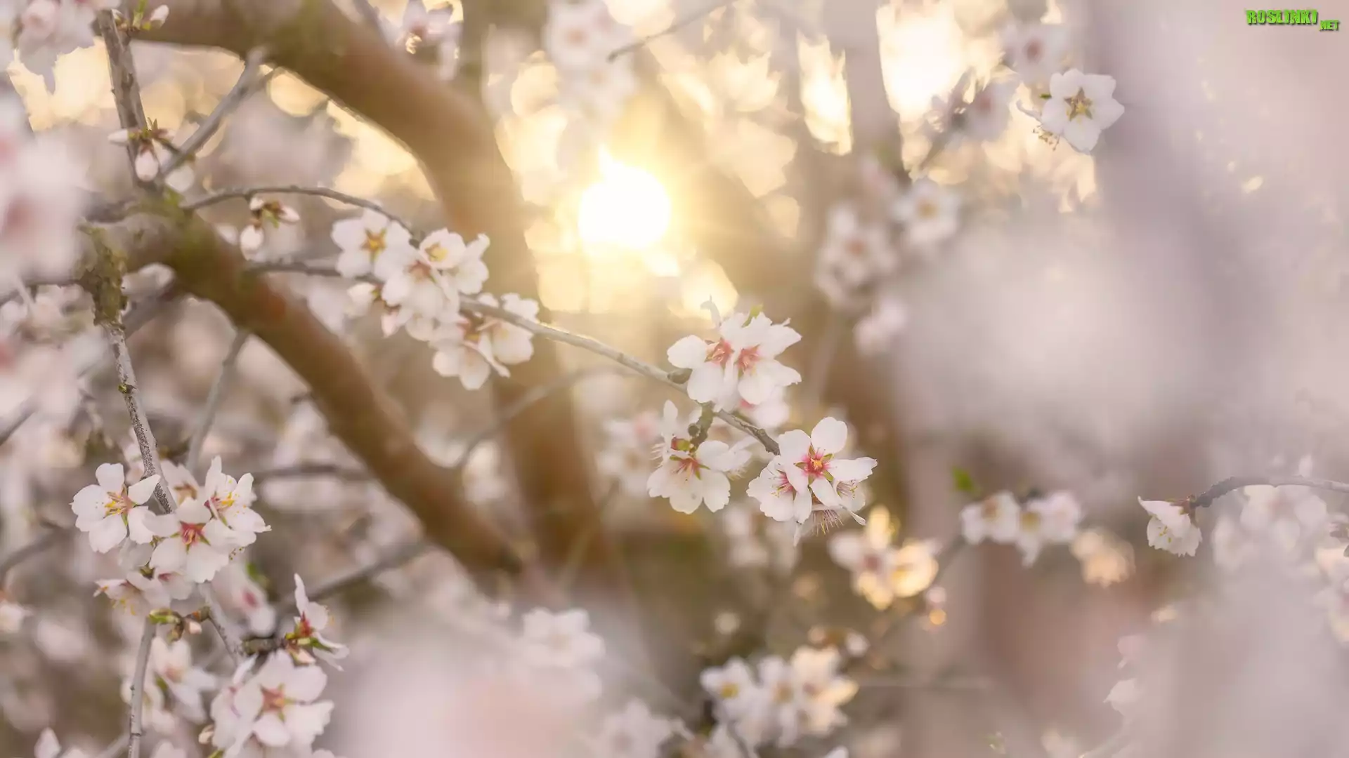 Rośliny: Drzewo owocowe, Kwiaty, Gałęzie, Promienie słońca, Zamglenie